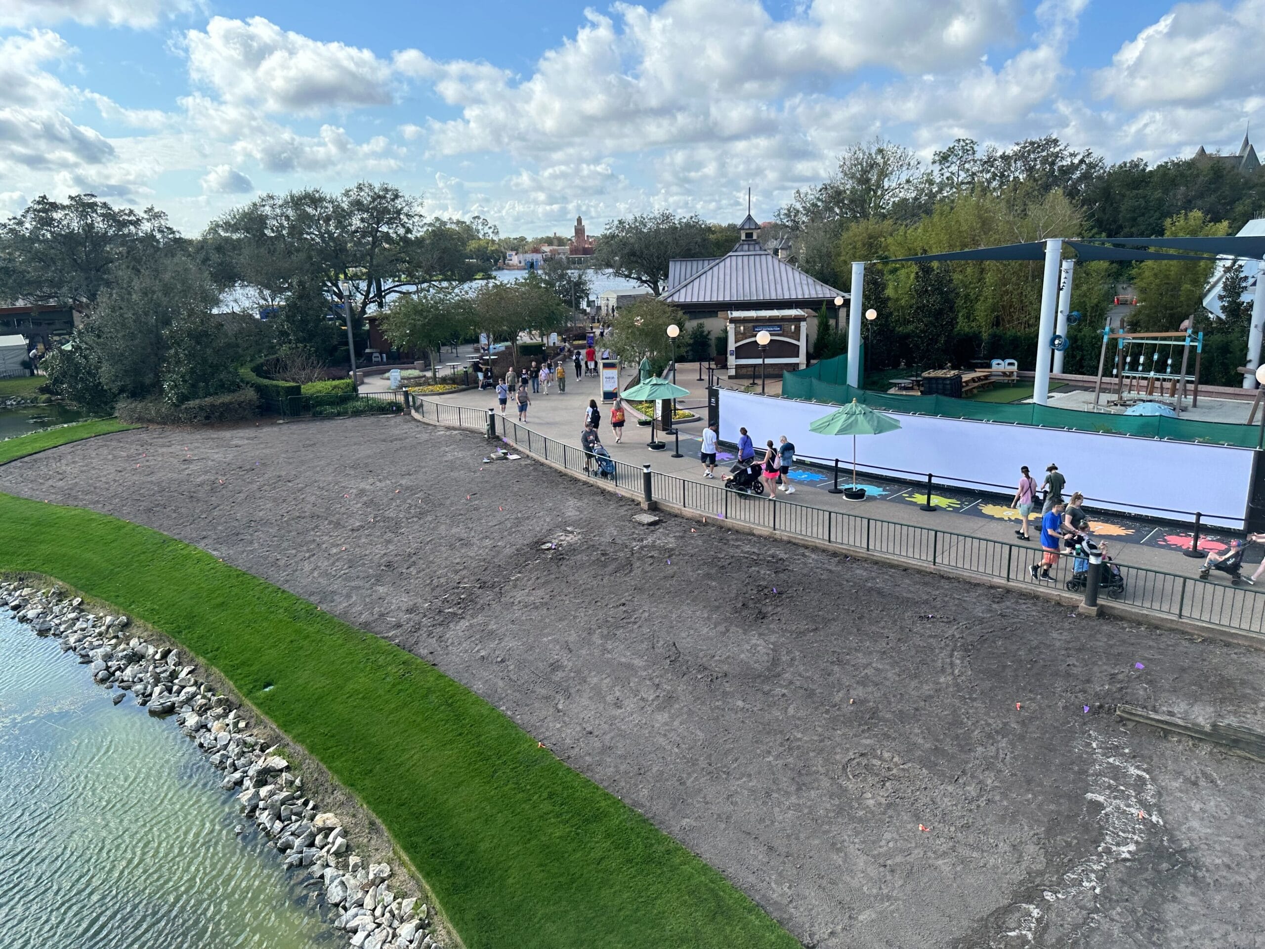 The land along the Rosewalk, leading towards World Showcase, has also been cleared and is currently a long patch of dirt. More flowerbeds will go here. Last year, a Goofy topiary was also in this area.