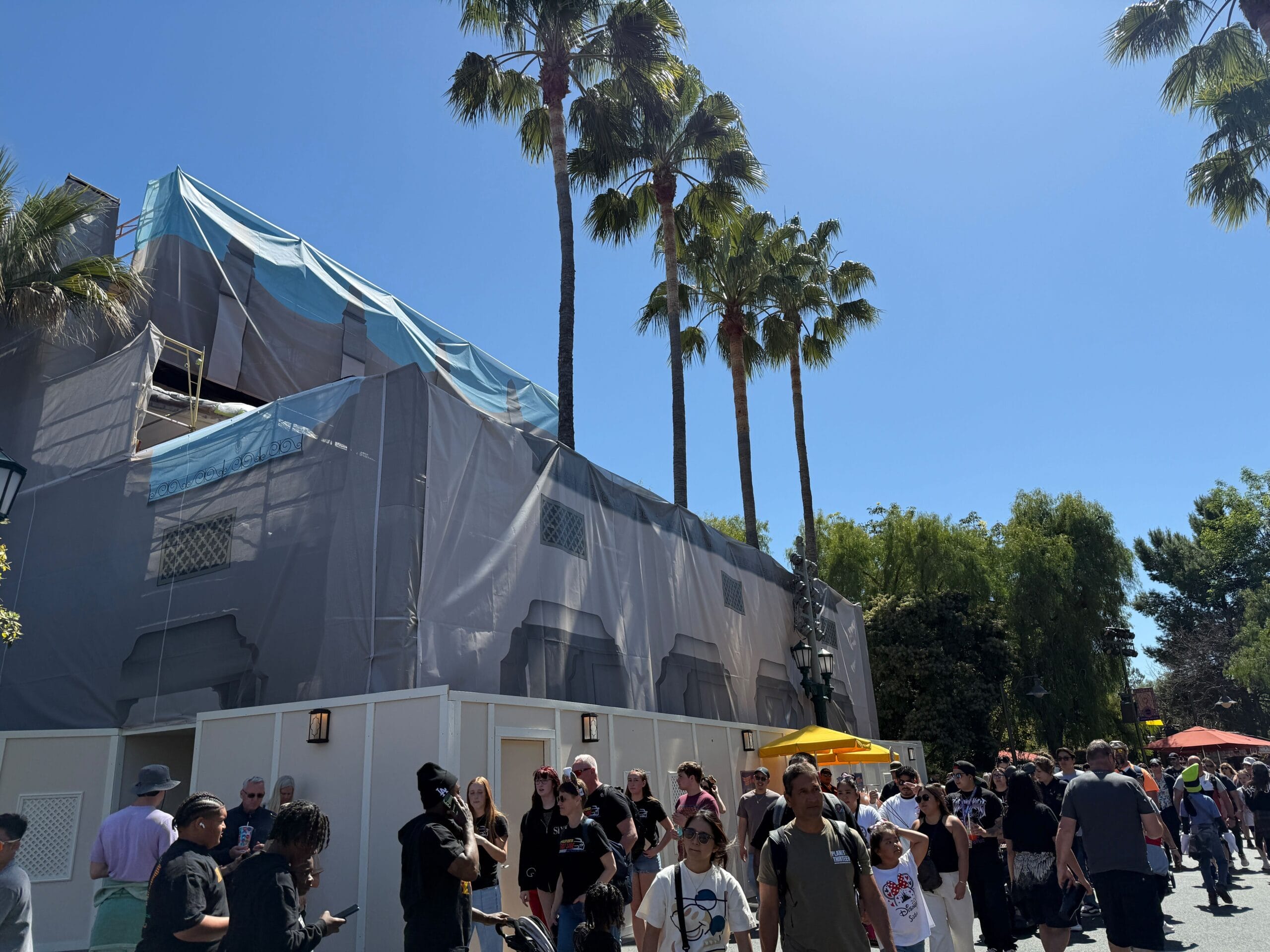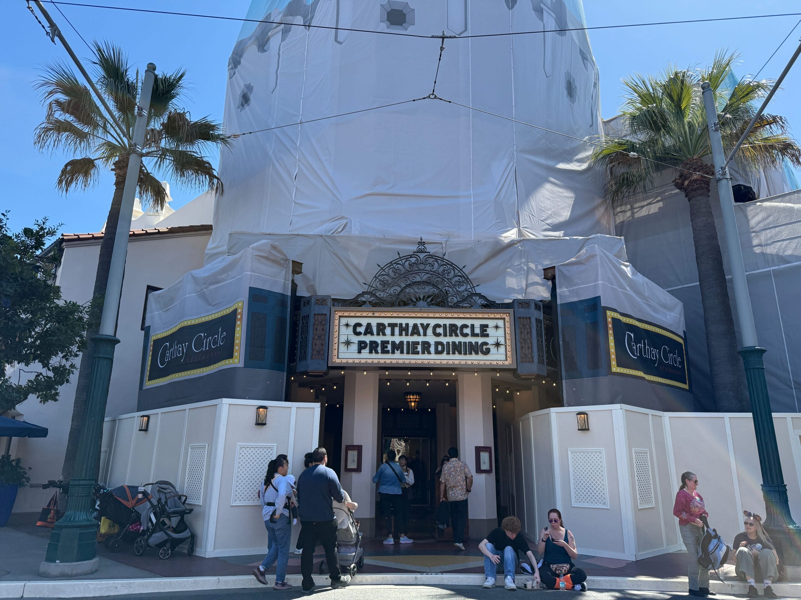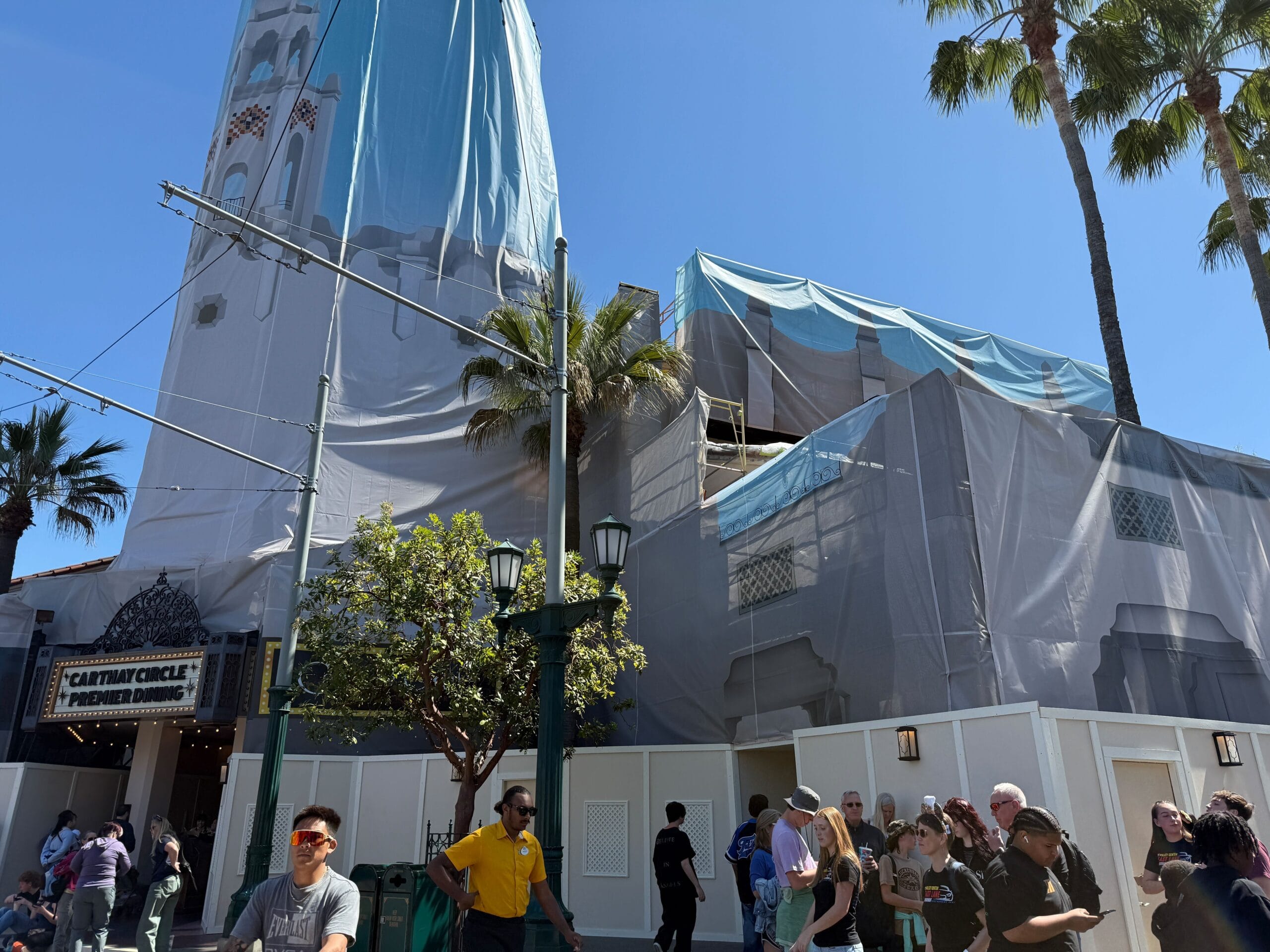 The plain beige scrims of Carthay Circle Restaurant have been replaced by printed themed scrims meant to “camouflage” the construction.