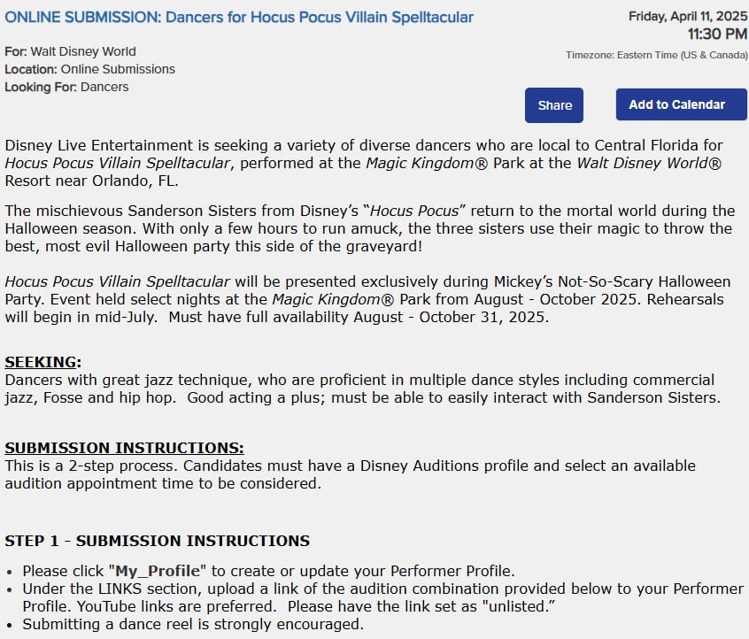 Hocus Pocus Villain Spelltacular will be presented exclusively during Mickey’s Not-So-Scary Halloween Party. Event held select nights at the Magic Kingdom Park from August – October 2025. Rehearsals will begin in mid-July. Must have full availability August – October 31, 2025.