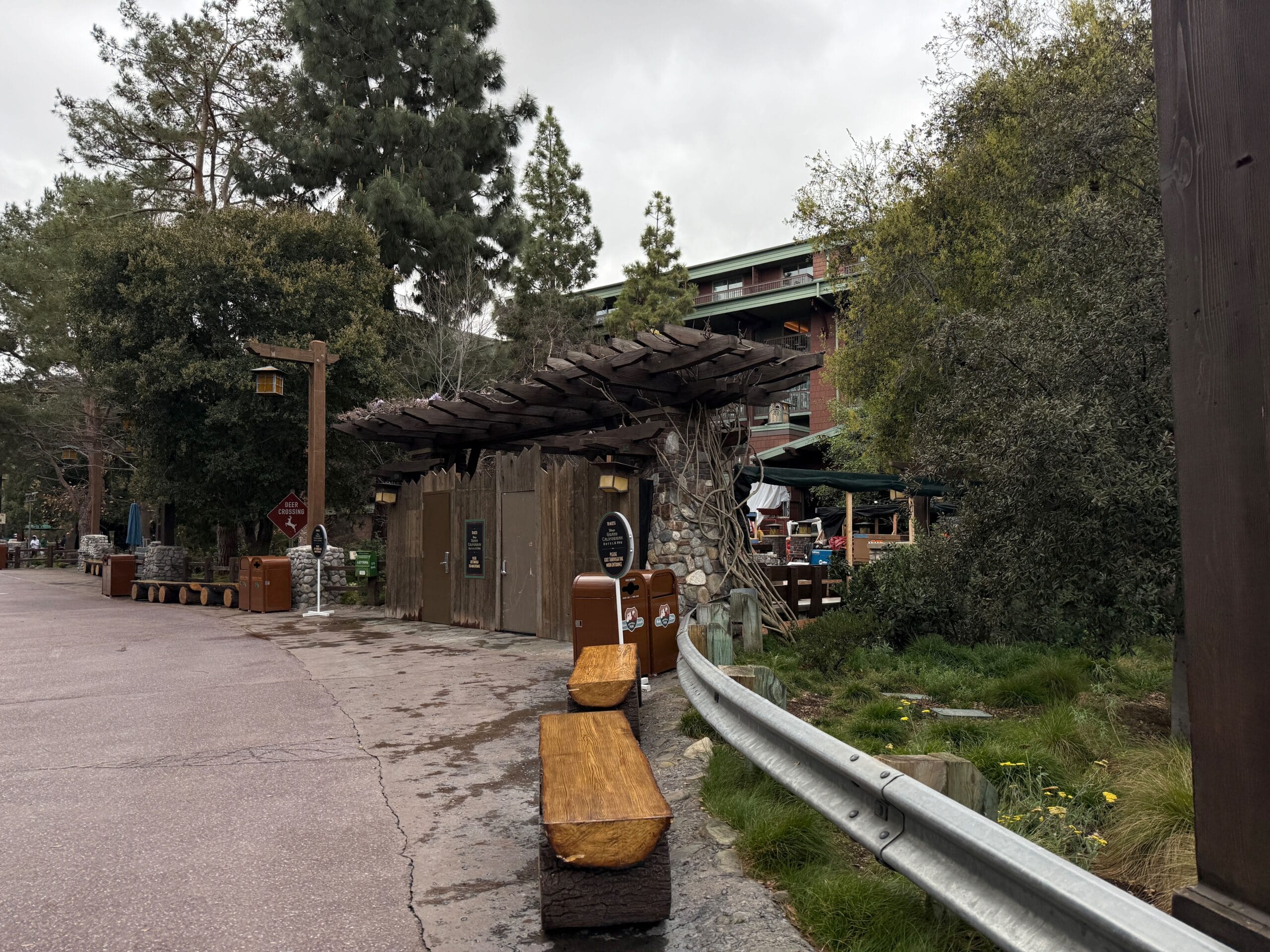 A rustic wooden entrance with a sign, surrounded by lush trees and foliage, near a paved path and benches, reminiscent of Disney’s Grand Californian Hotel style at a theme park entrance.