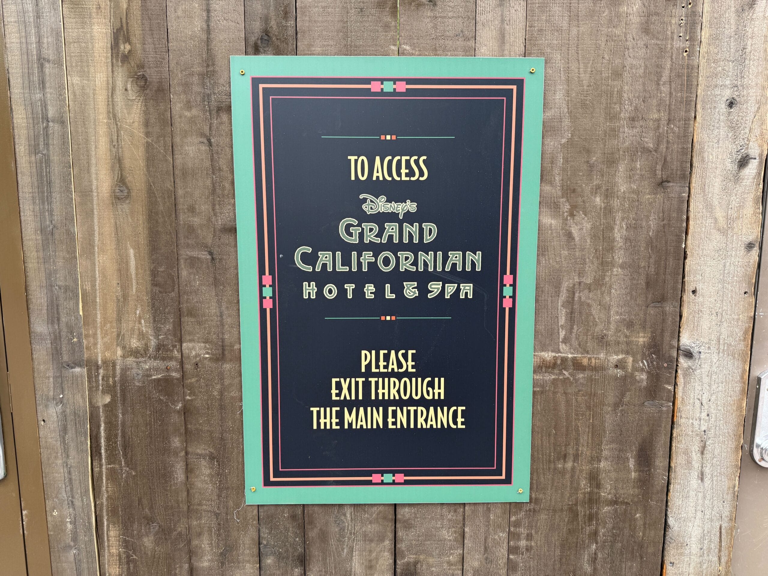 Sign on wooden wall reads: "To access Disney’s Grand Californian Hotel & Spa, please exit through the main entrance of the theme park.