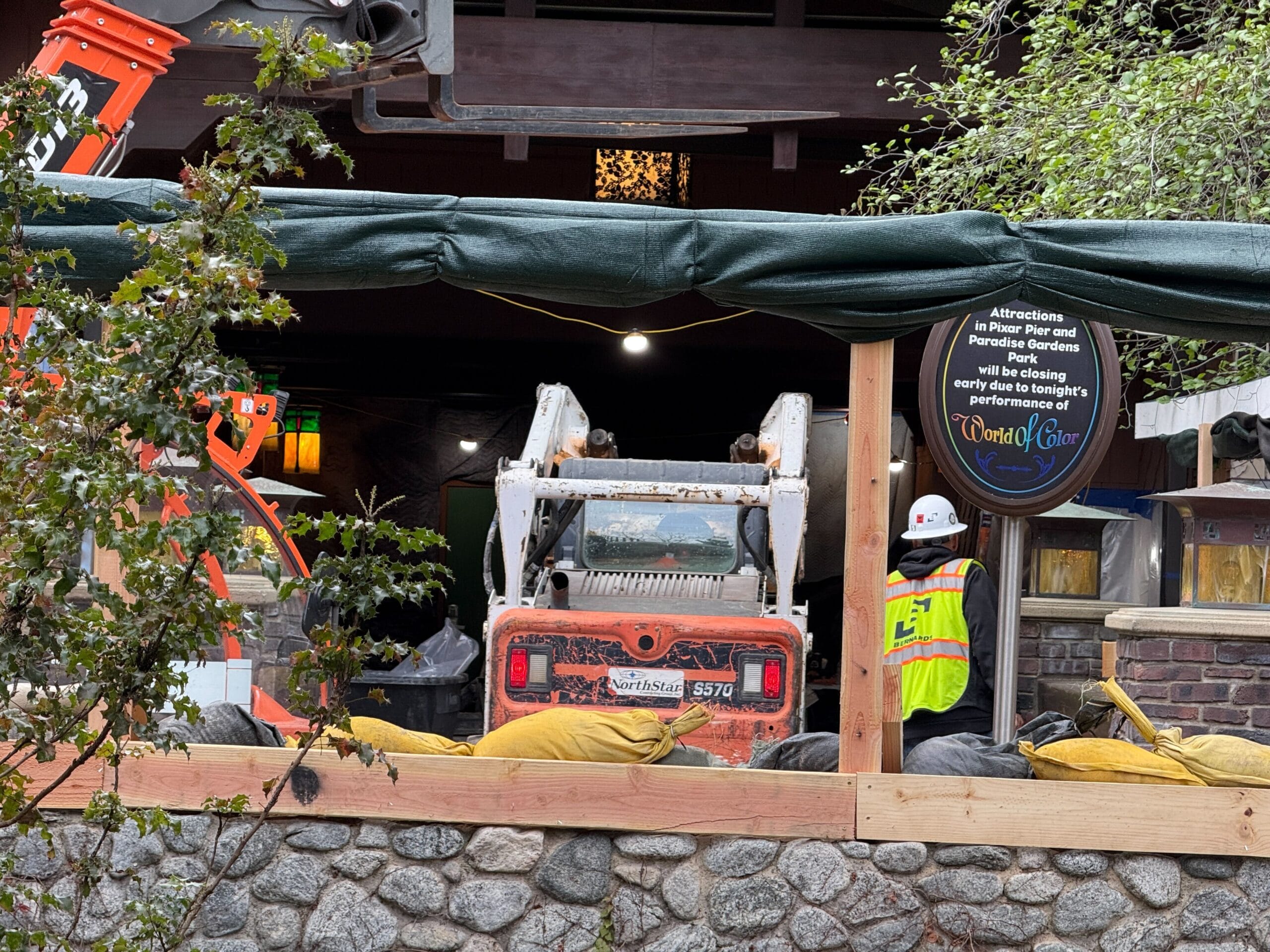 At the bustling construction site near Disney's Grand Californian Hotel, a small excavator maneuvers around sandbags. A worker in a hi-vis jacket and helmet adjusts a sign reading "World of Color." Part of the themed park entrance is covered with green tarpaulin, hinting at exciting developments ahead.