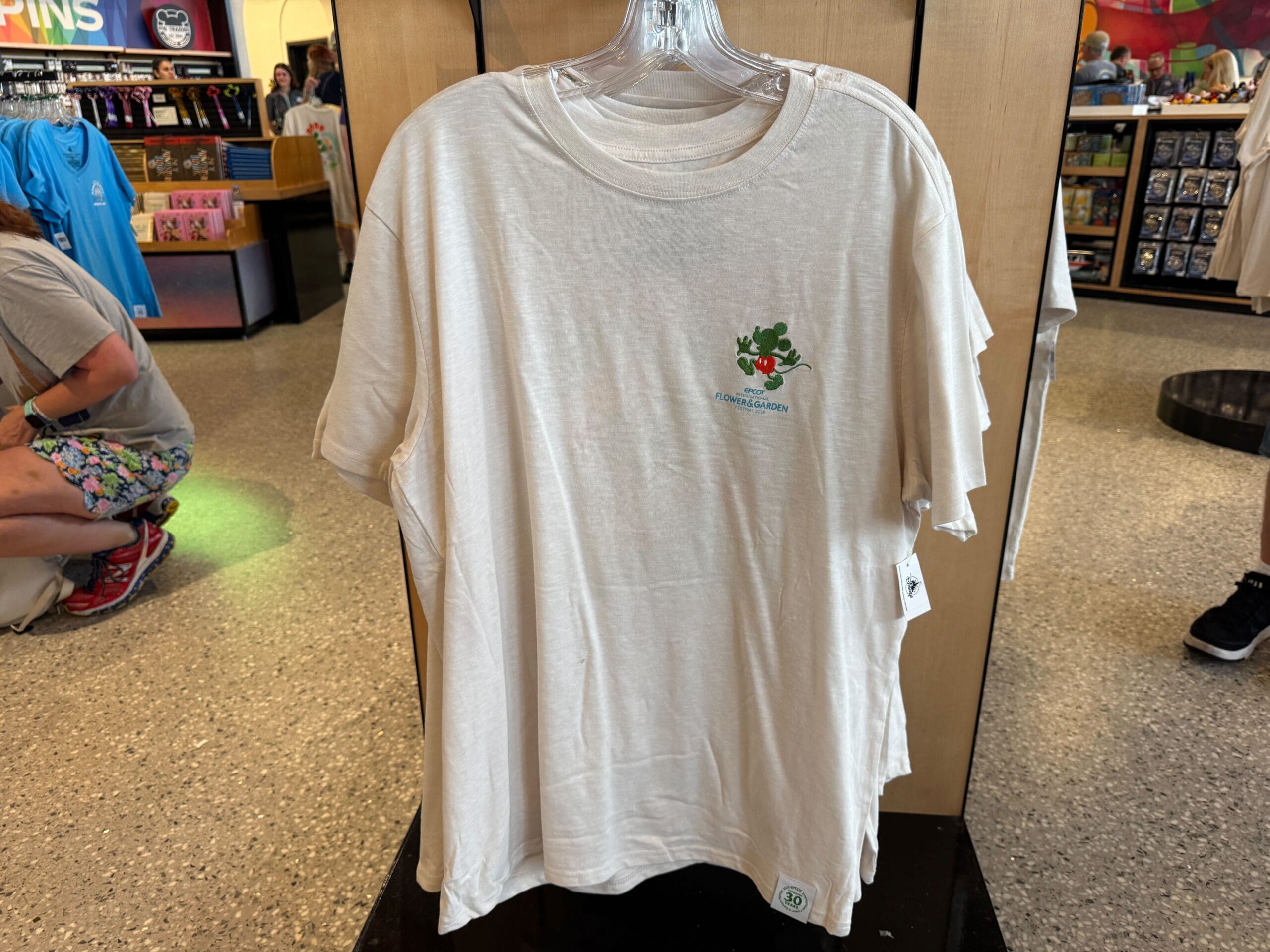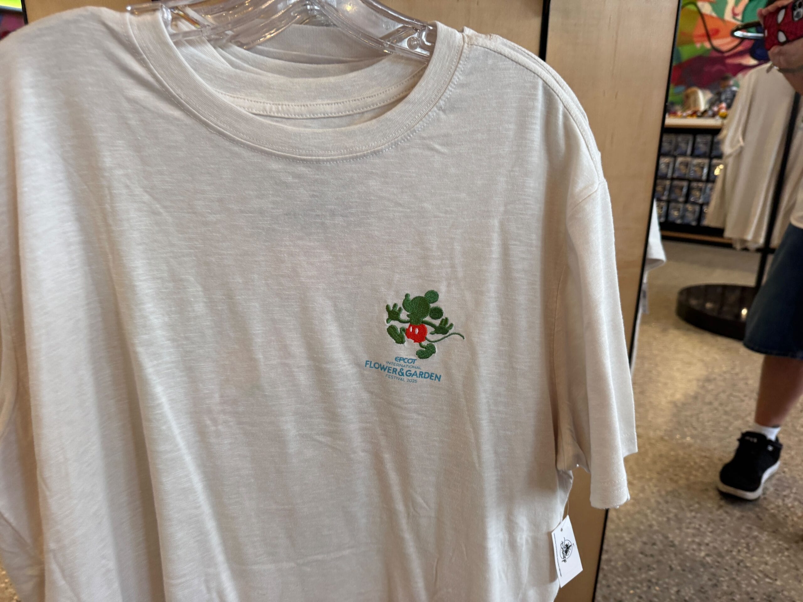 The T-shirt is off-white. The Mickey topiary icon is embroidered on the left of the chest. It depicts Mickey as a green silhouette with his iconic red shorts. Below the topiary image is “EPCOT International Flower & Garden Festival 2025” in blue.