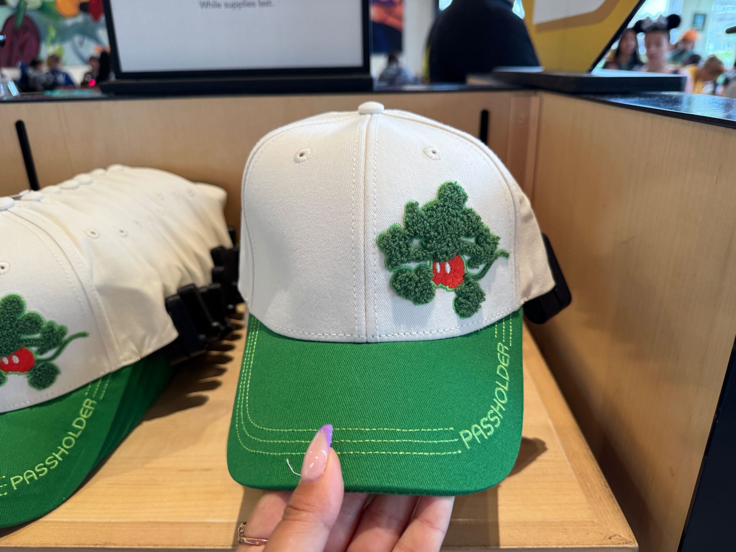 The ball cap is white with a green brim. The lime green stitching includes “Passholder” along one edge. Off-center on the cap is a chenille version of the Mickey topiary image.