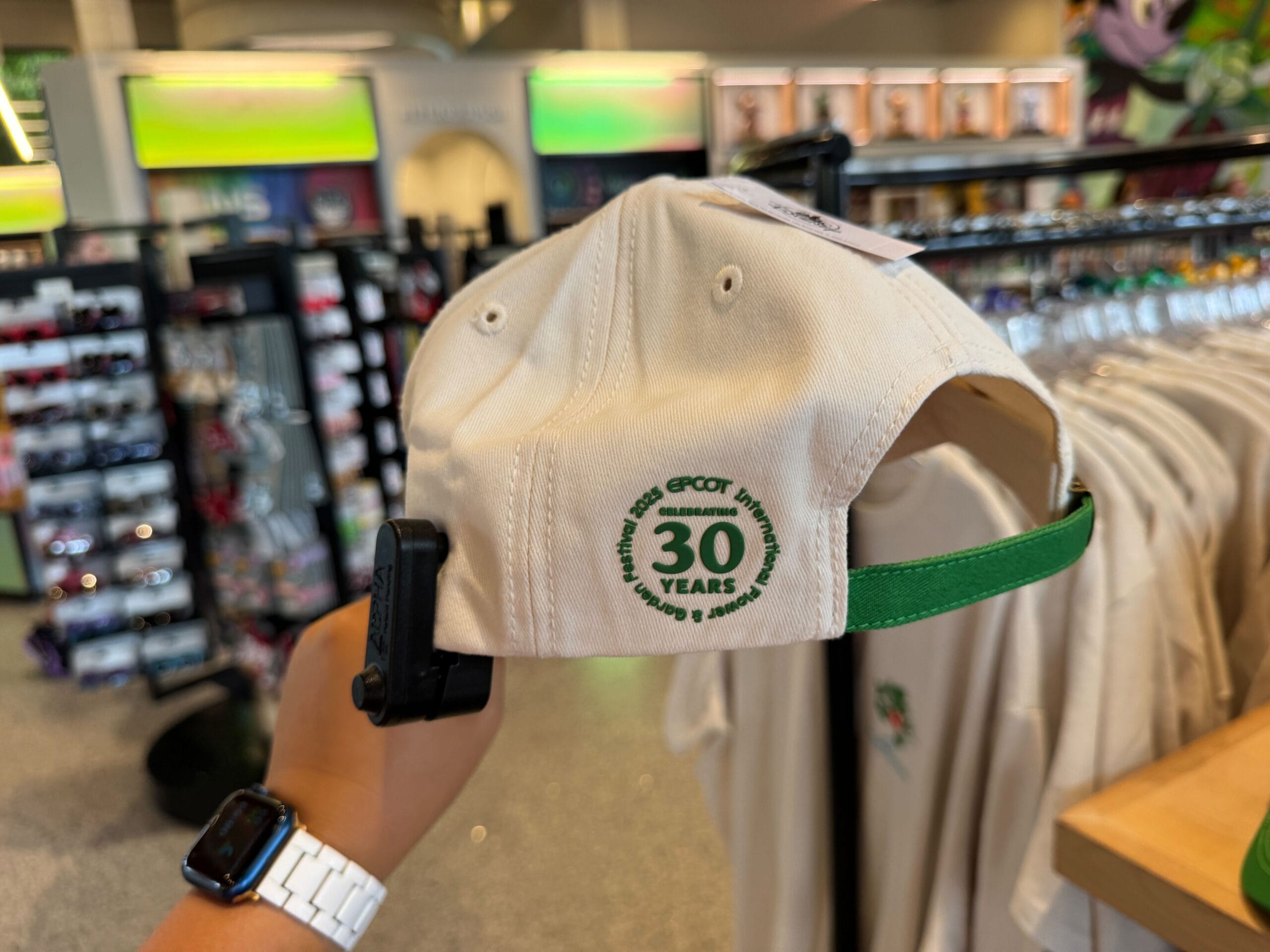 A logo for the 30th anniversary of the EPCOT International Flower & Garden Festival is in silicone on the back. The adjustable strap is green.