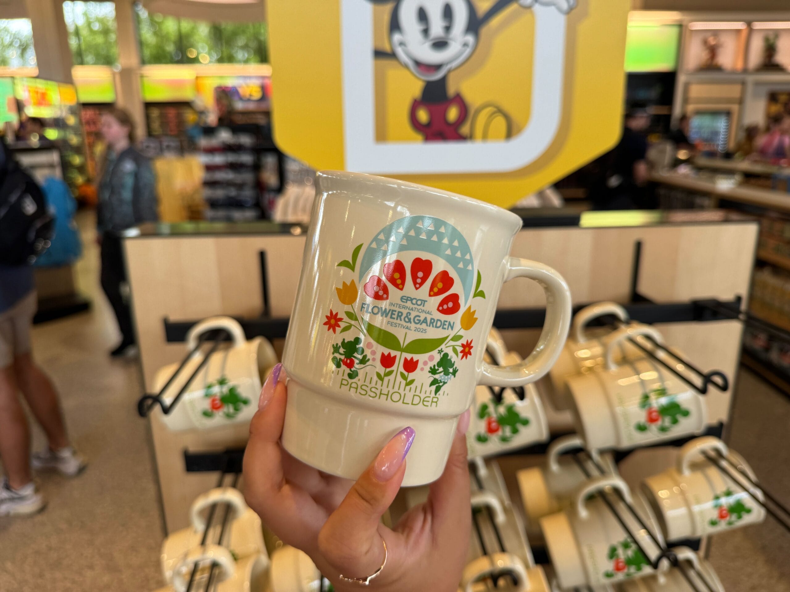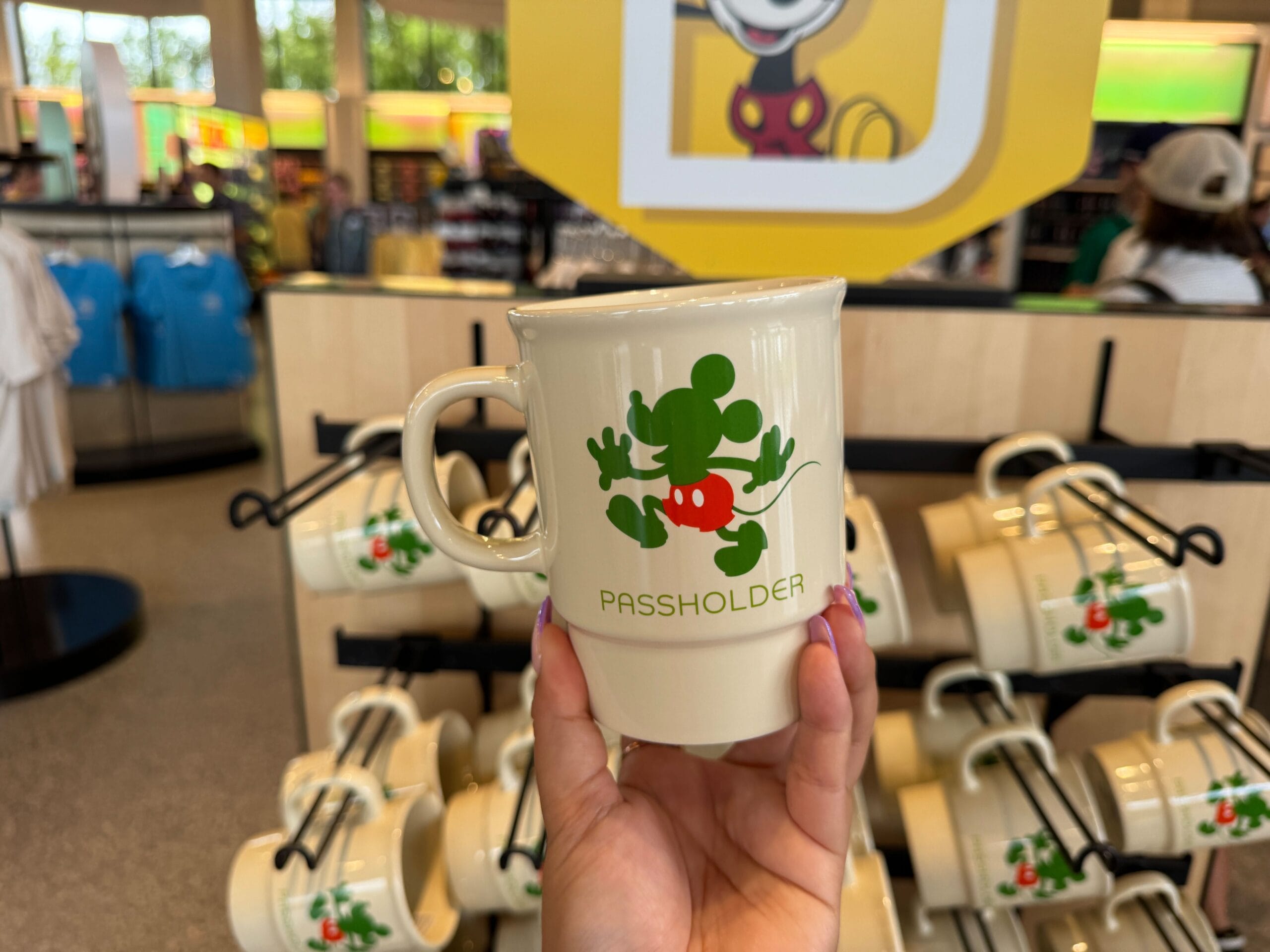 This off-white mug features the Mickey topiary on one side with “Passholder” printed below.