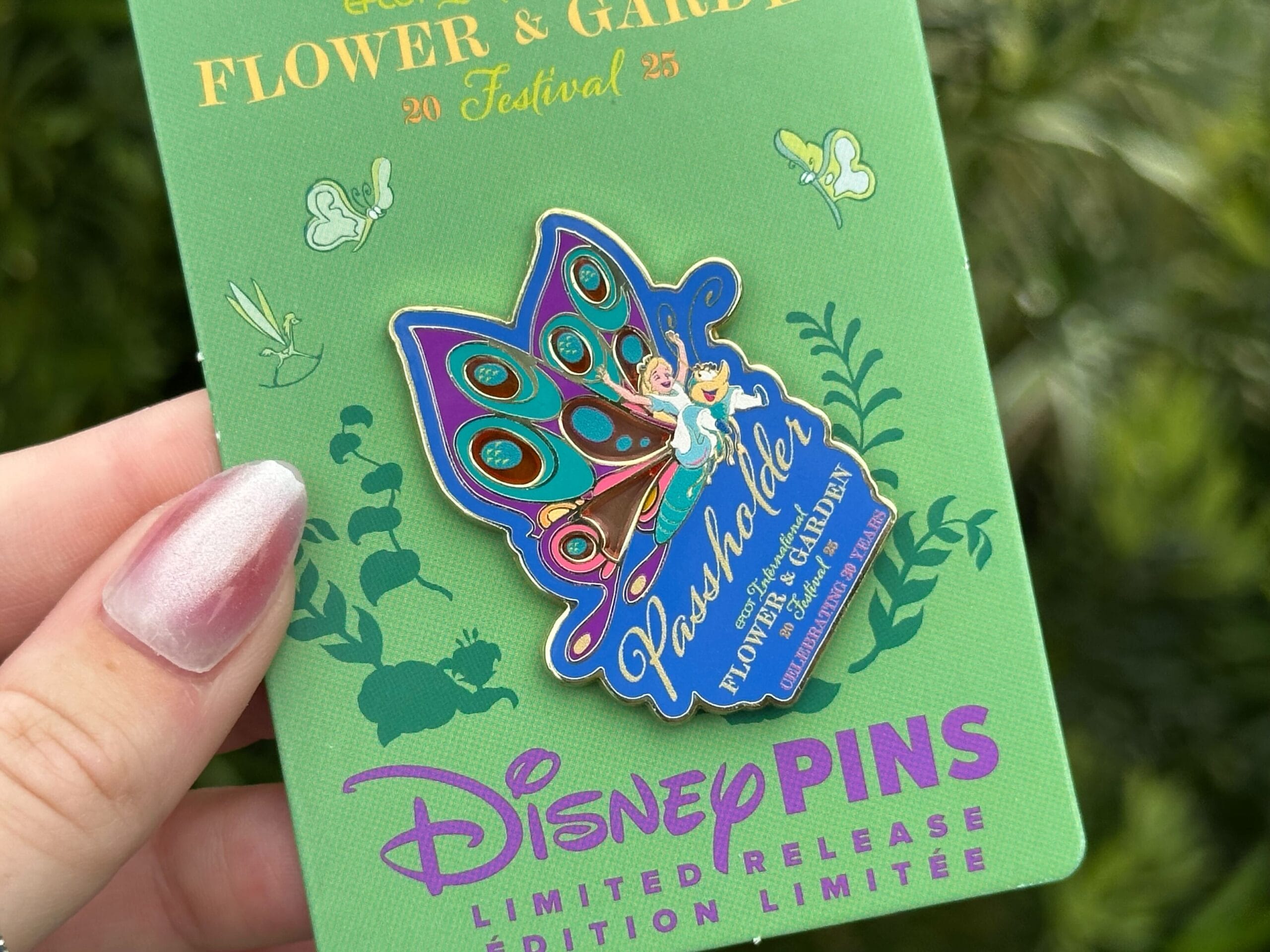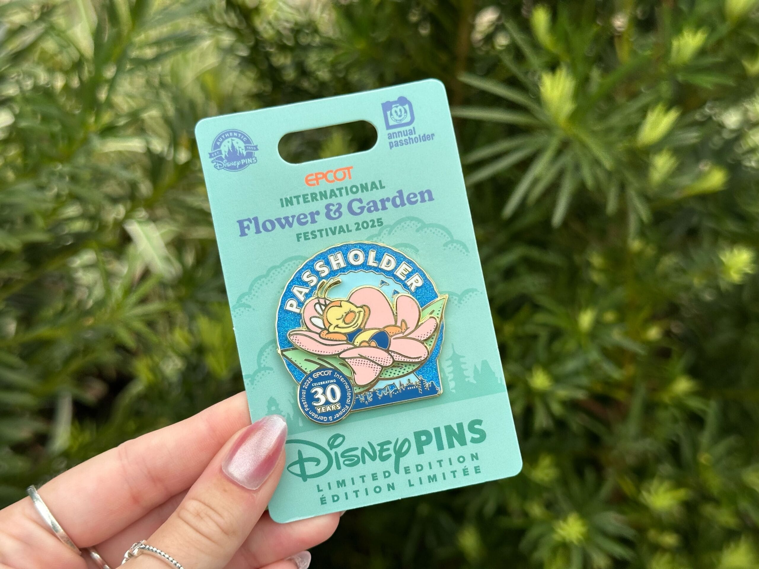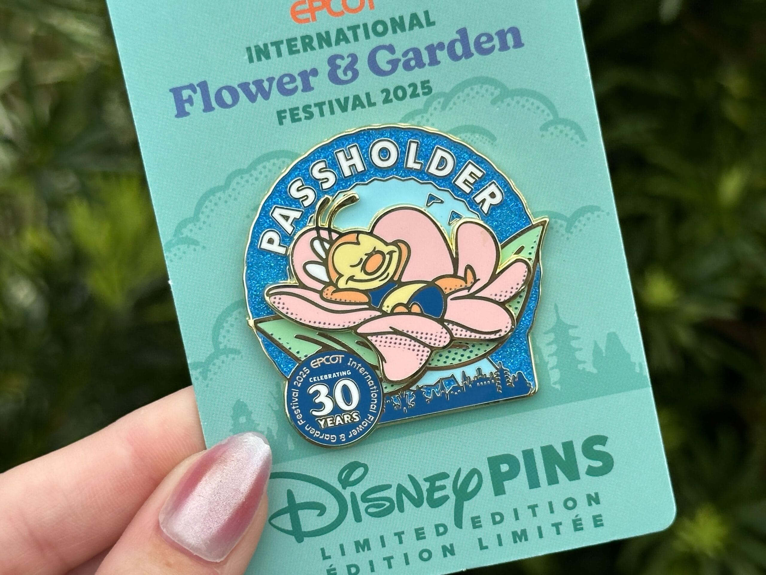 This Passholder-exclusive pin matches the “Alice in Wonderland” merchandise collection. It depicts Alice riding on the back of a caterpillar. “Passholder” is in yellow script above “EPCOT International Flower & Garden Festival 2025 Celebrating 30 Years.”