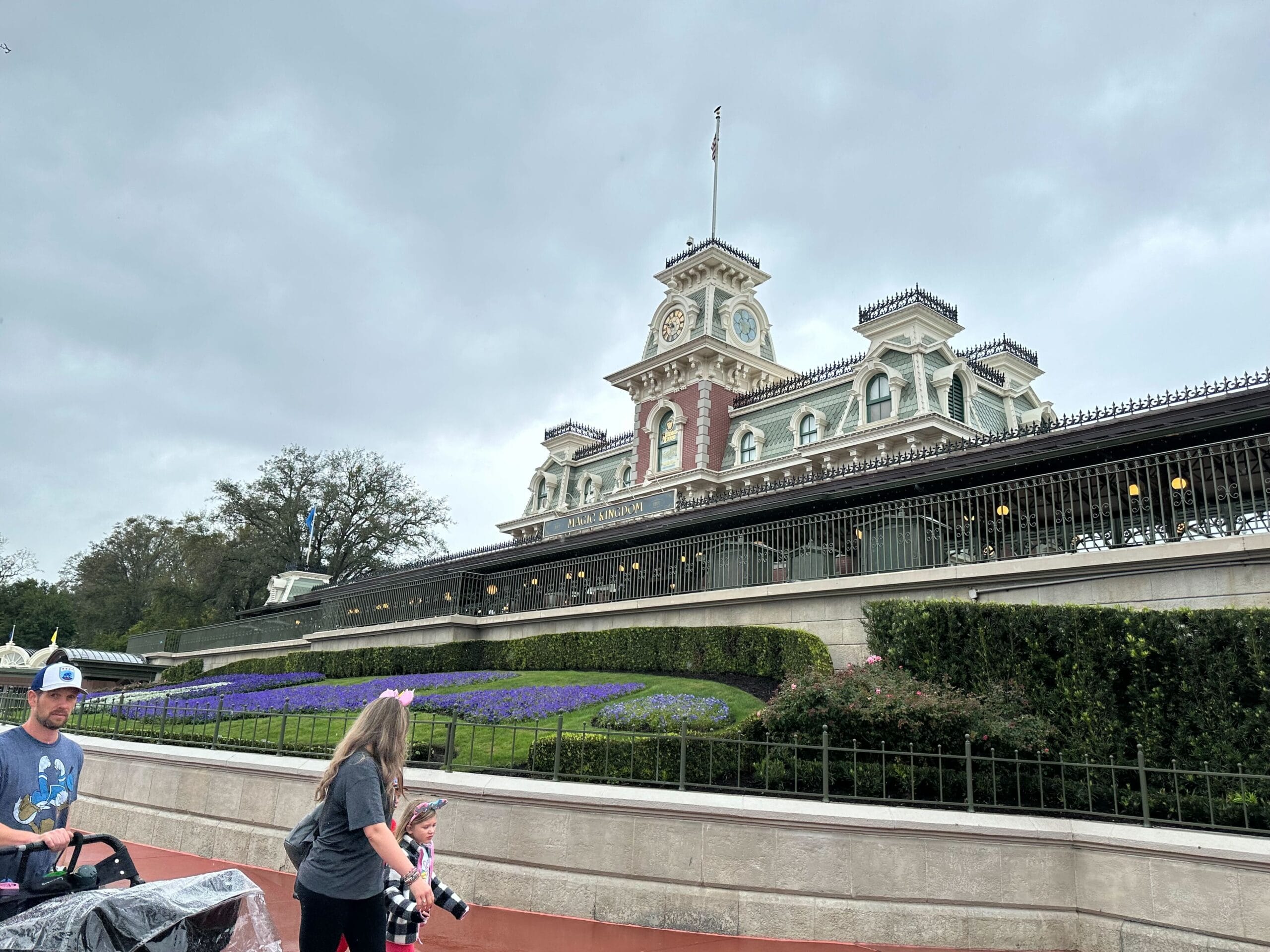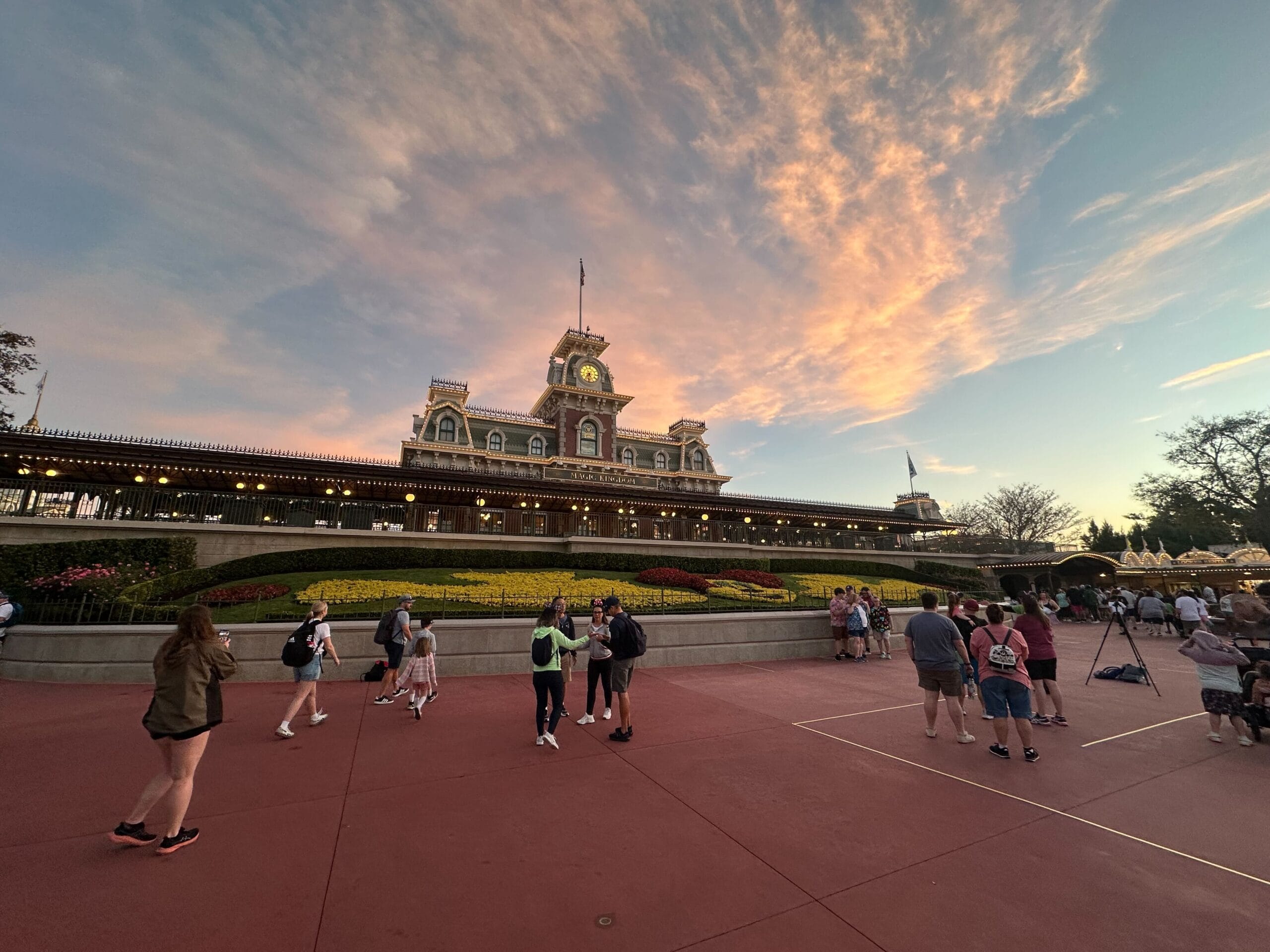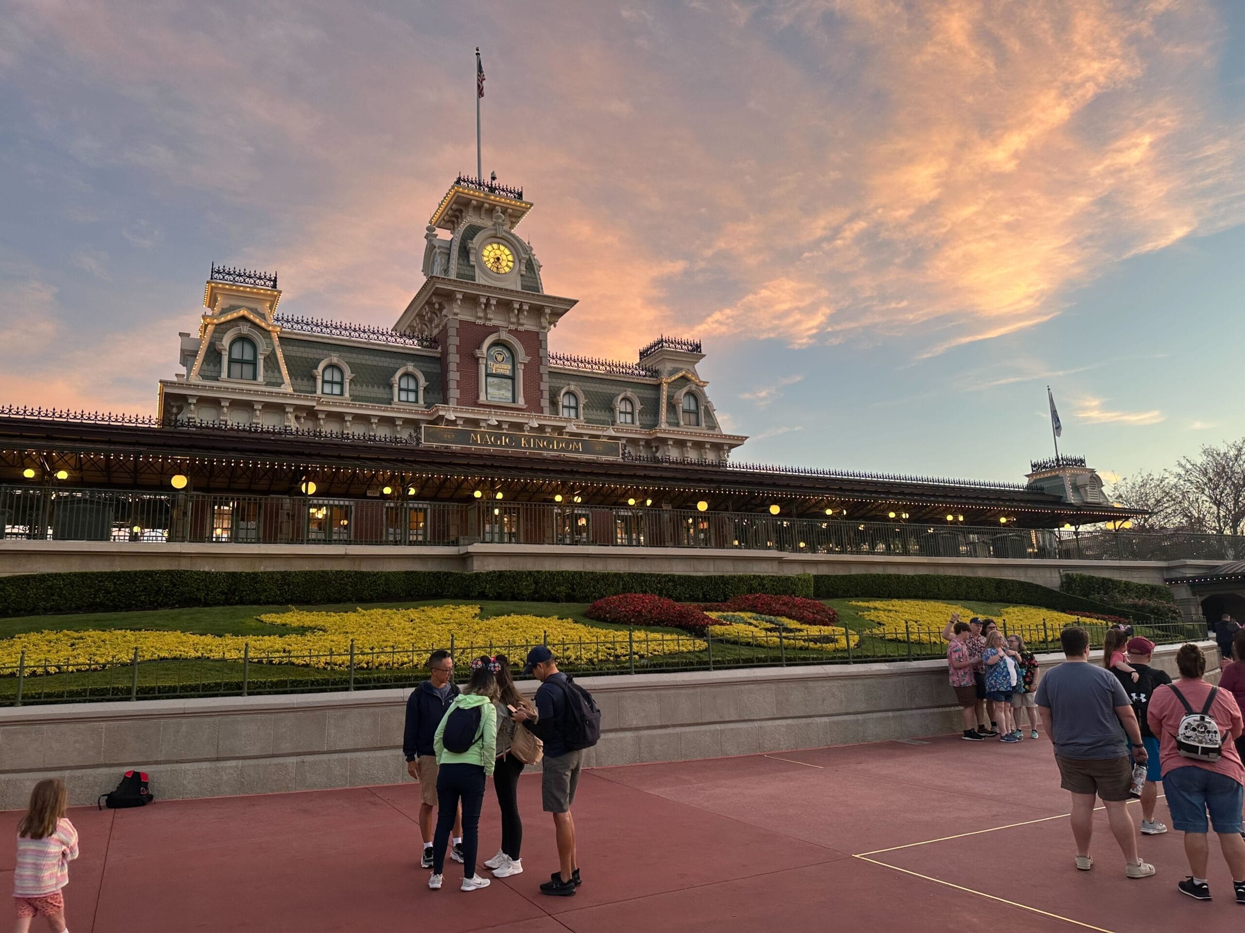 This spot is a popular place for guests to snap a photo before heading into the Magic Kingdom to begin their park day. The flower bed usually changes throughout the seasons and the new flowers are likely for springtime.