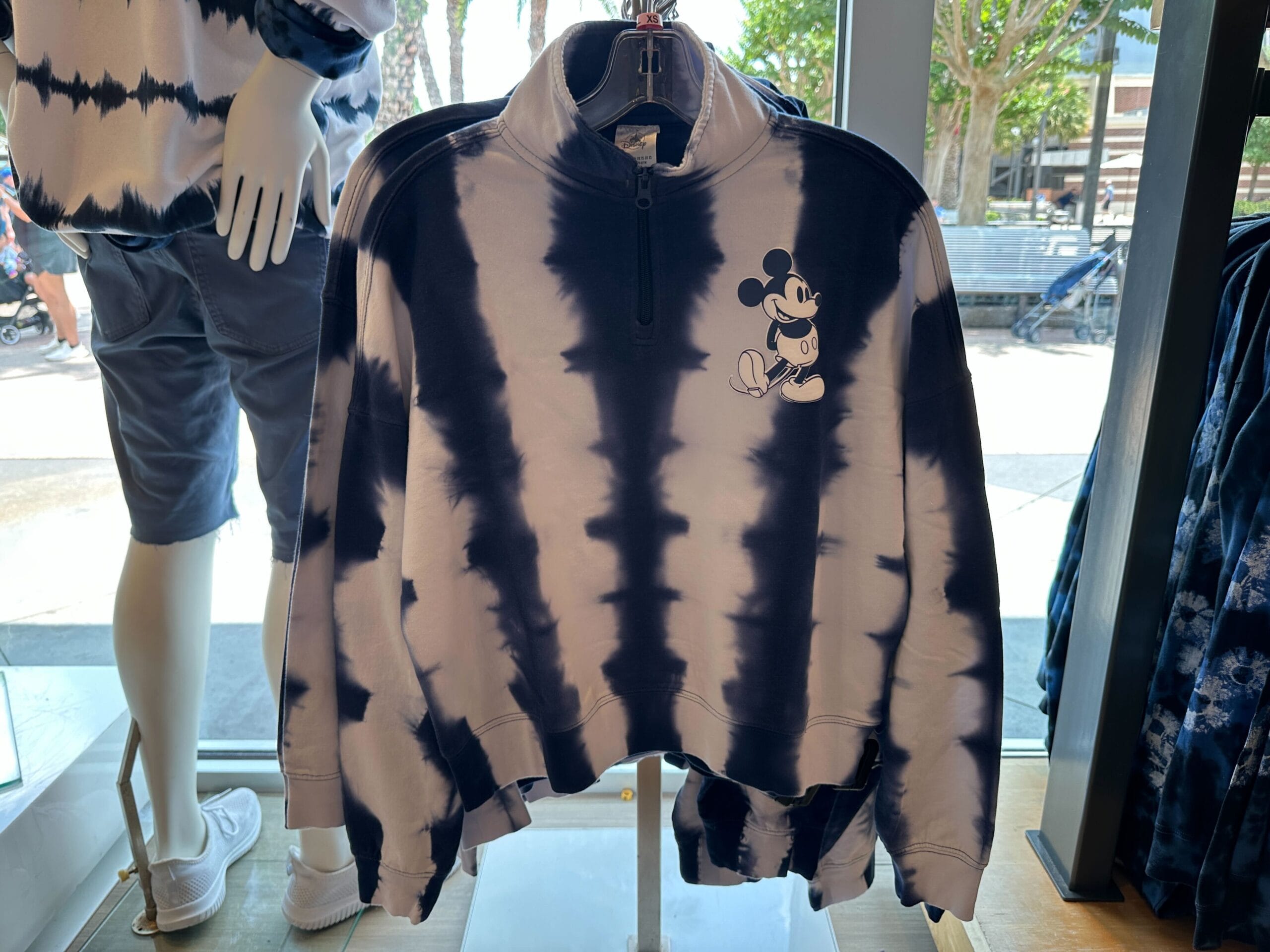 This pullover sweatshirt has the same design as the tee, with tie-dye stripes and Mickey on the chest. It has longer sleeves, ribbed cuffs, a ribbed hem, and a ribbed crew neck.