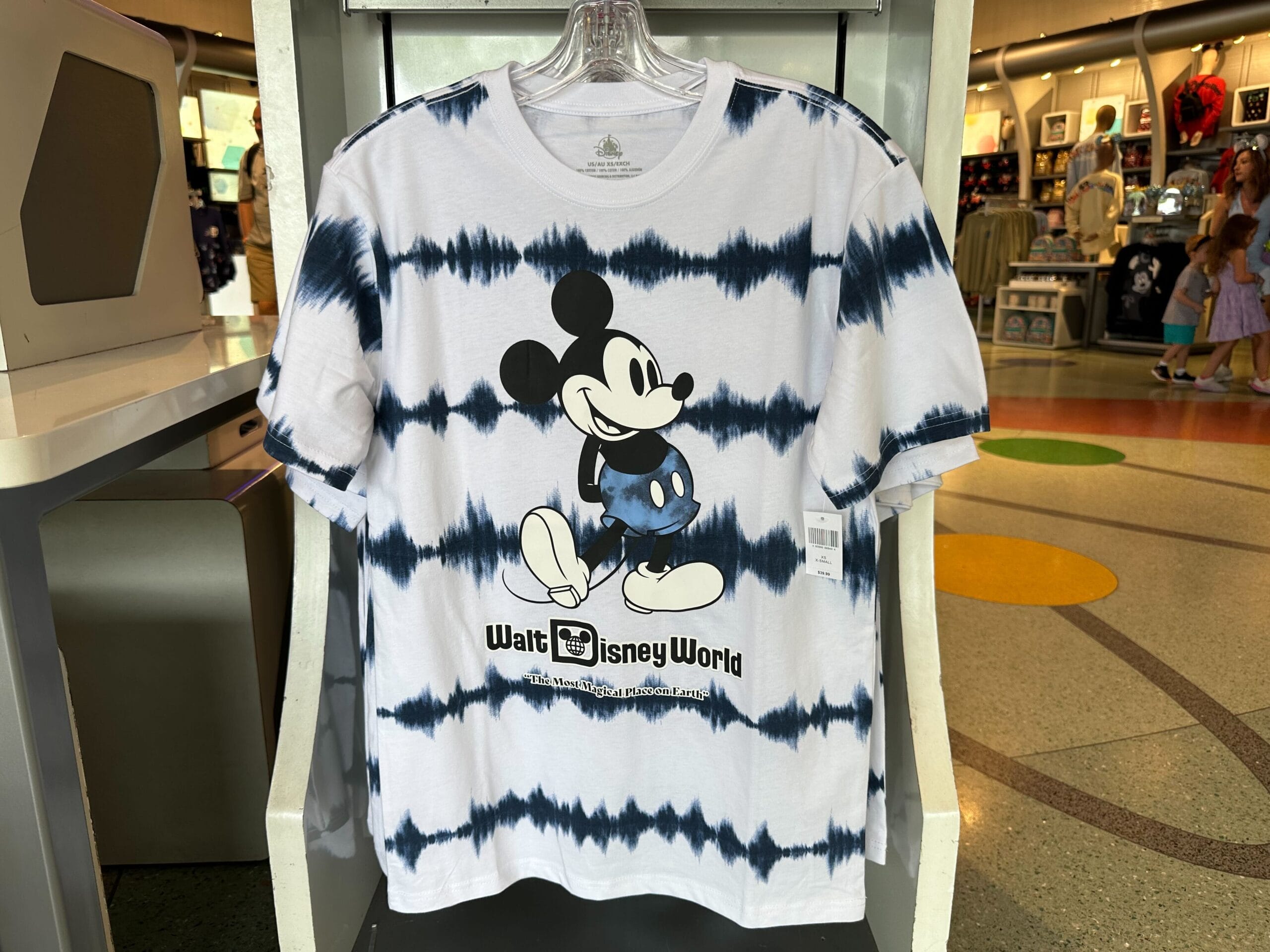 The tee is white with stripes of blue “tie-dye” across it. Mickey is pictured in black and white on the chest, and his shorts are blue tie-dye. “Walt Disney World” and “The Most Magical Place on Earth” are printed in black and white letters below the main mouse.