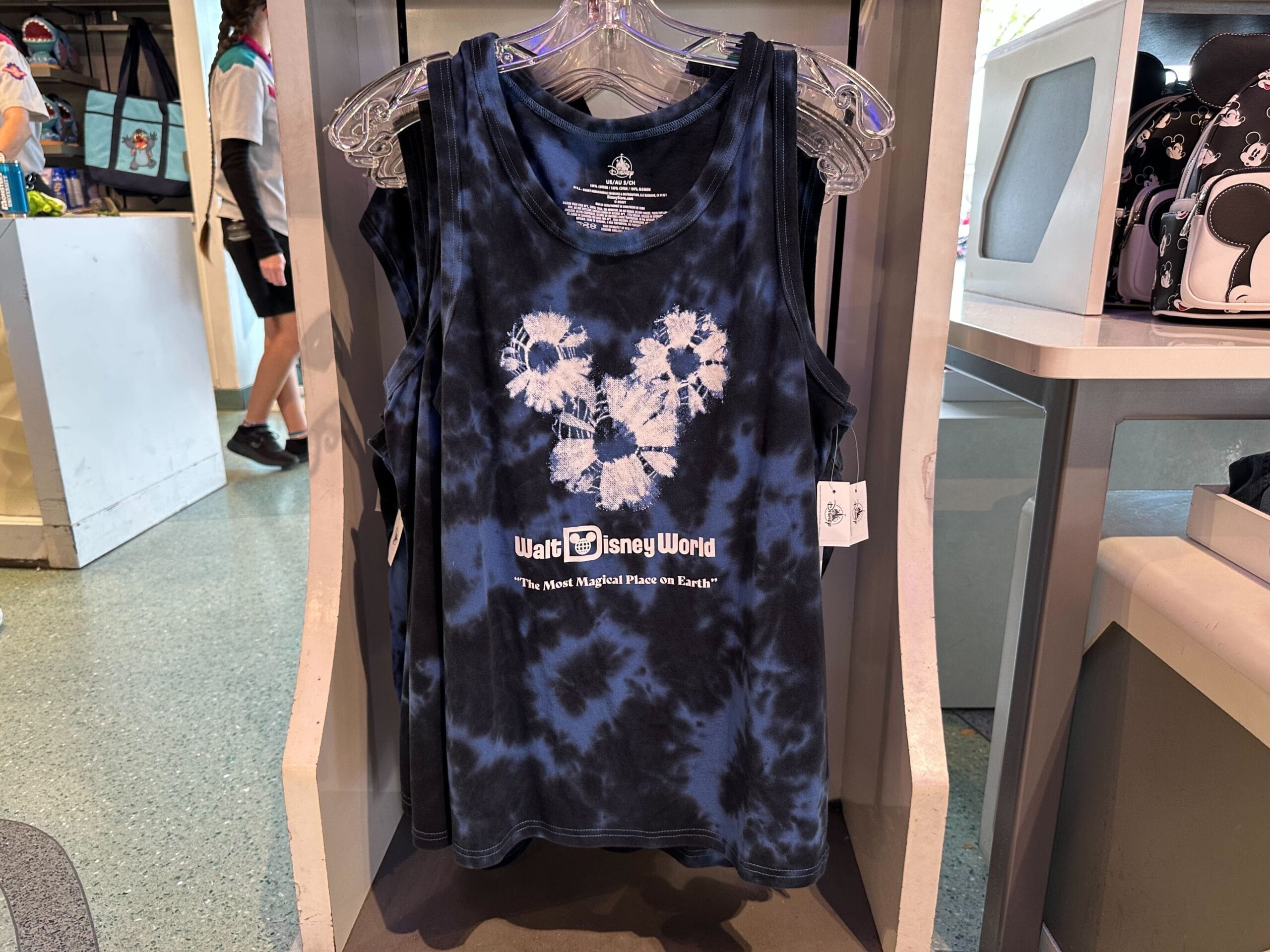 The tank has an all-over blue and black tie-dye pattern. A Mickey head icon is in the center in white splotches, as though it was painted on. “Walt Disney World” and “The Most Magical Place on Earth” are in white.