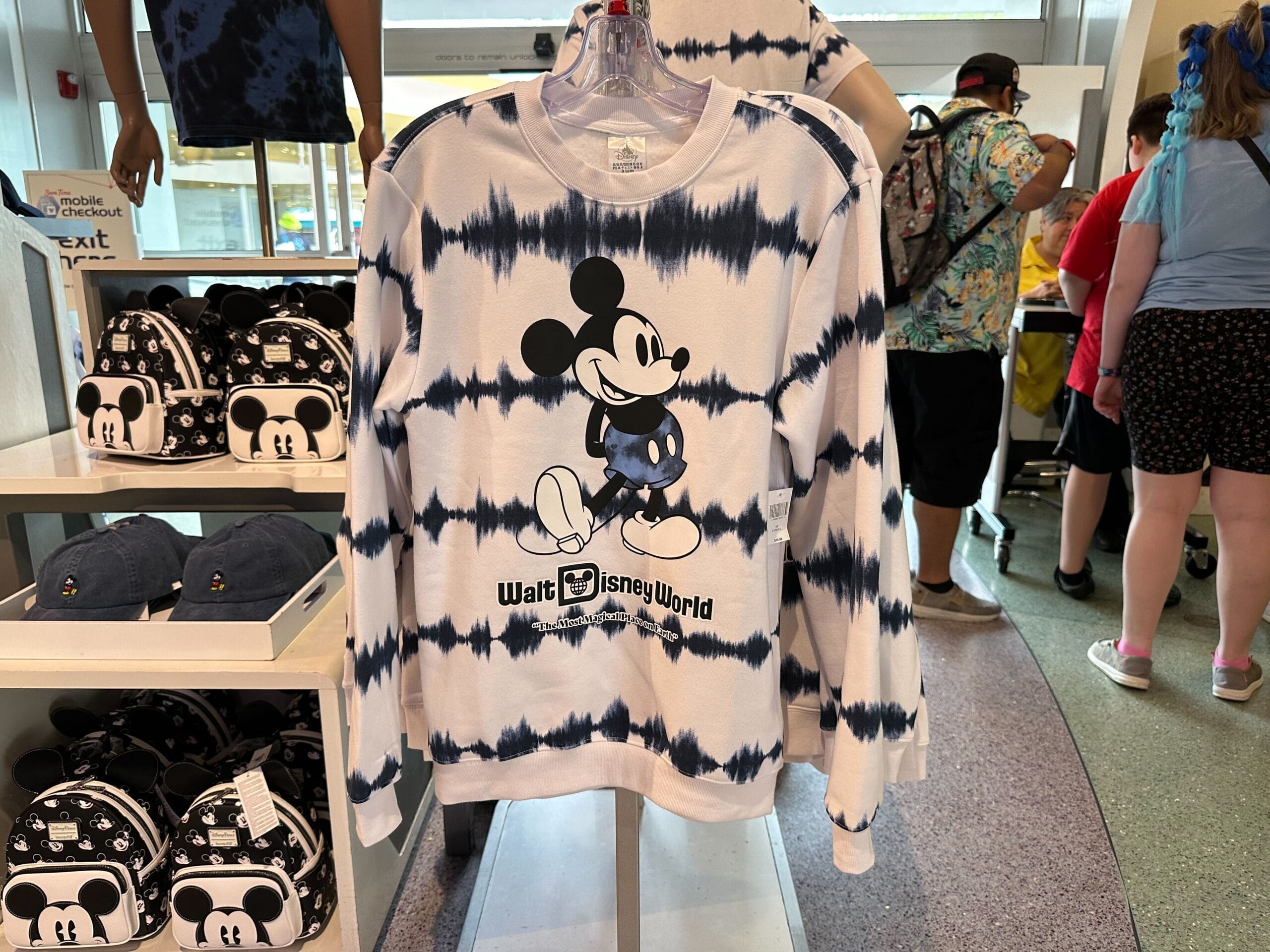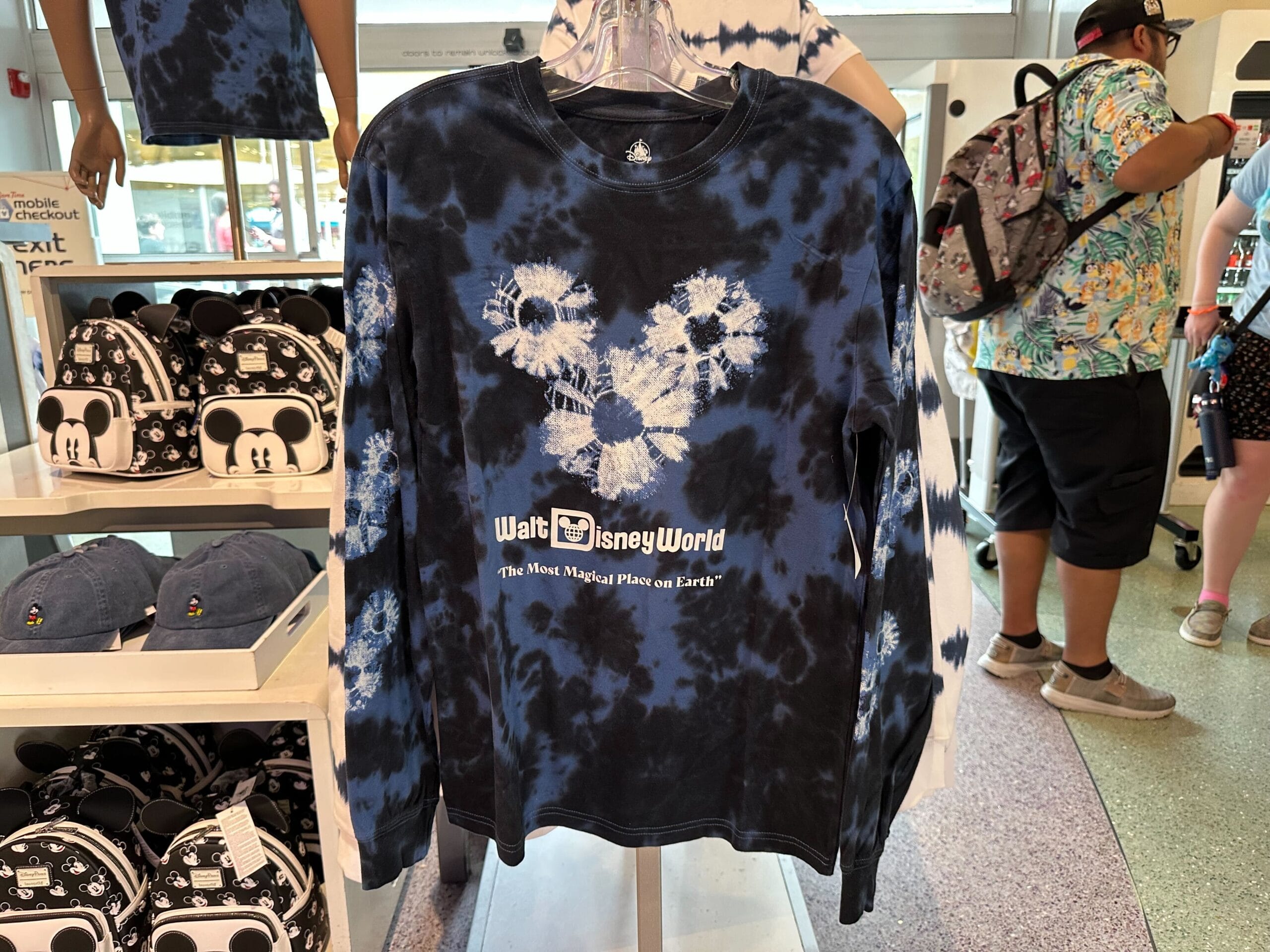 The long-sleeved shirt is the same blue and black pattern as the tank. The cuffs are ribbed. It has the painted white Mickey icon on the chest above “Walt Disney World” and “The Most Magical Place on Earth.”