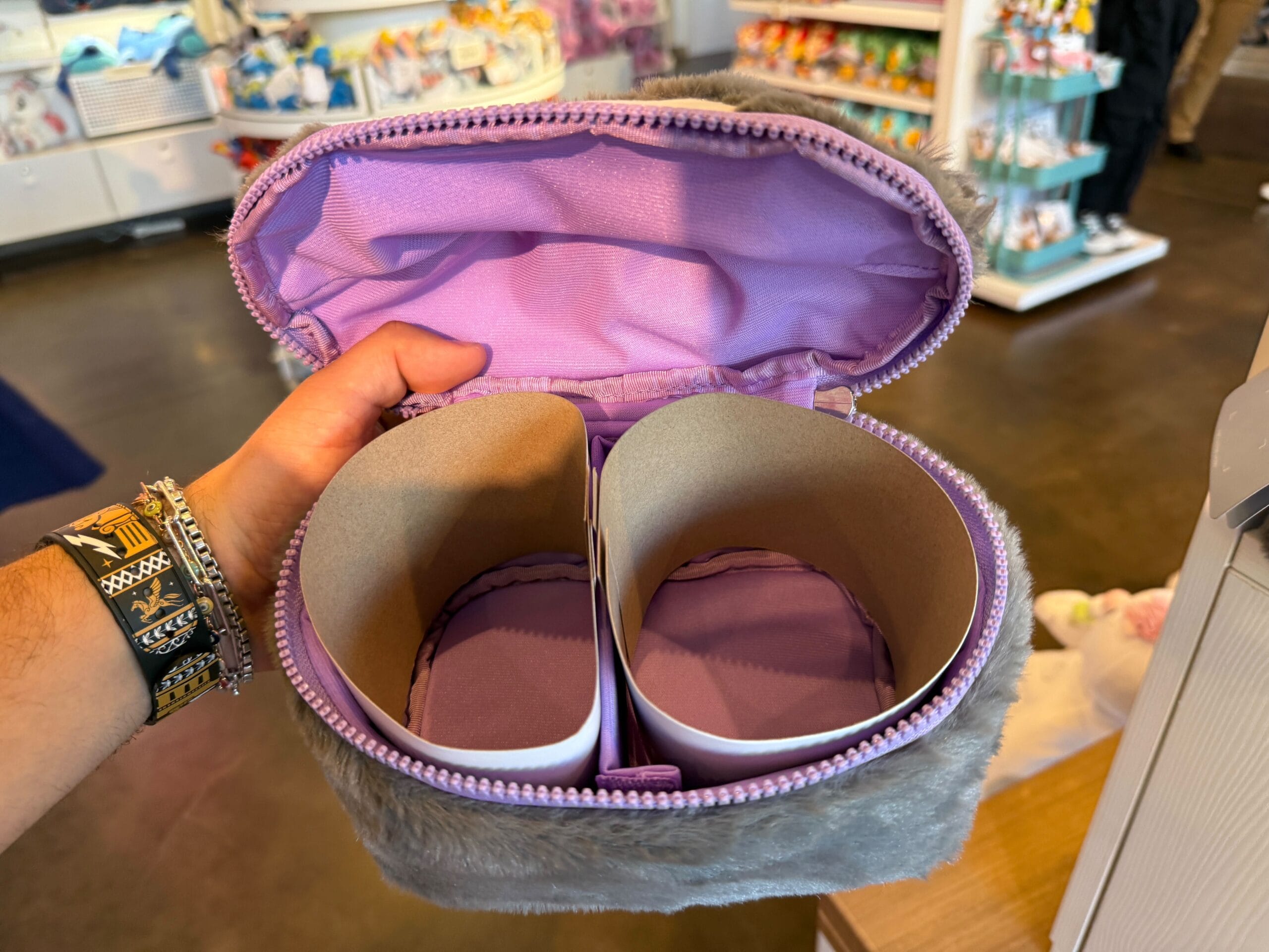 The bag has a fuzzy dark gray exterior reminiscent of Lucifer’s fur. A purple zipper runs around the bag. It has a fuzzy gray handle on the top.