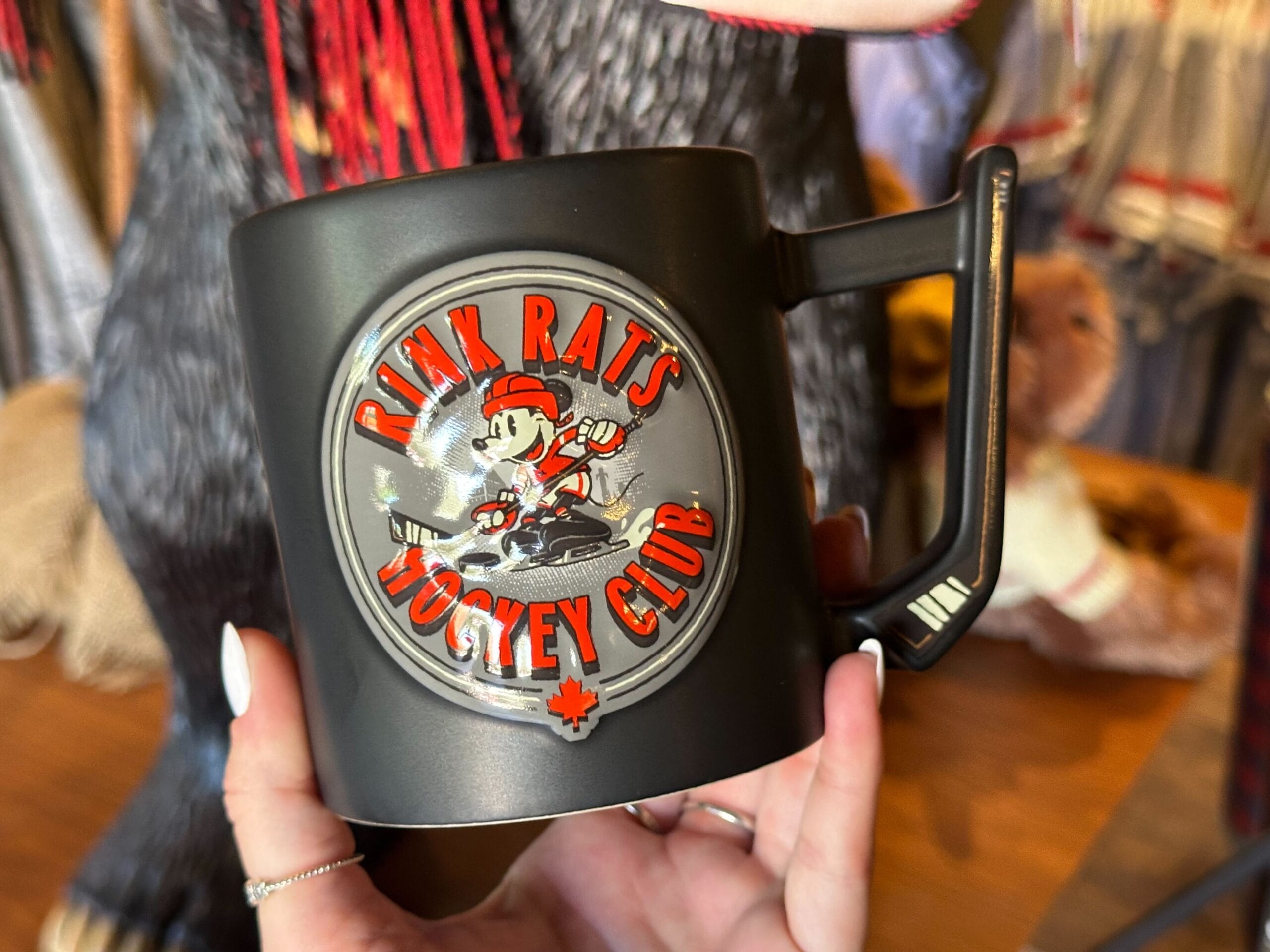 The mug holds 16 ounces / 450 milliliters. It has a black matte finish and a handle shaped like a hockey stick. On one side is a logo for the “Rink Rats Hockey Club” featuring red lettering and a picture of Mickey Mouse in hockey gear. A red maple leaf is at the bottom of the logo.