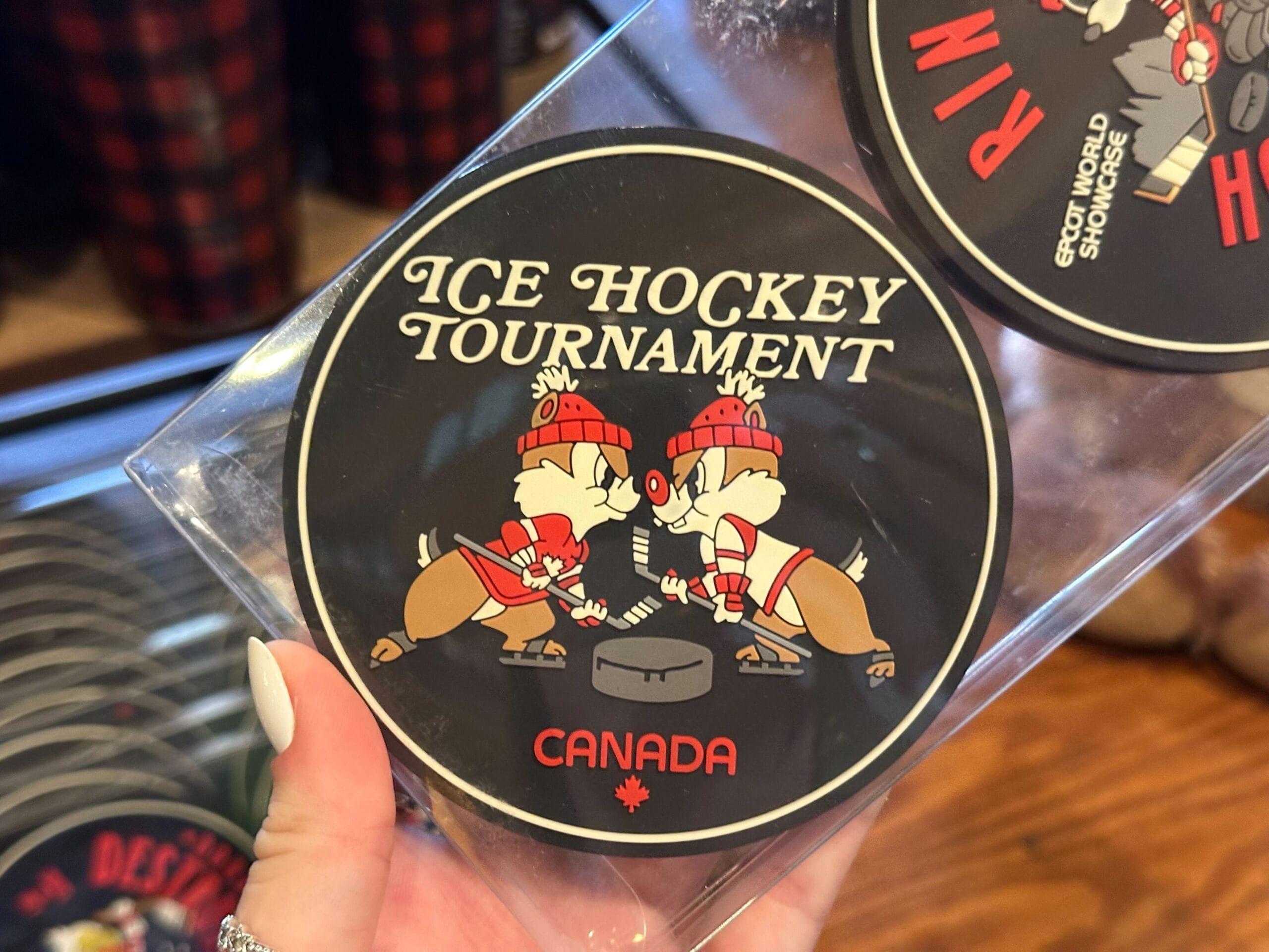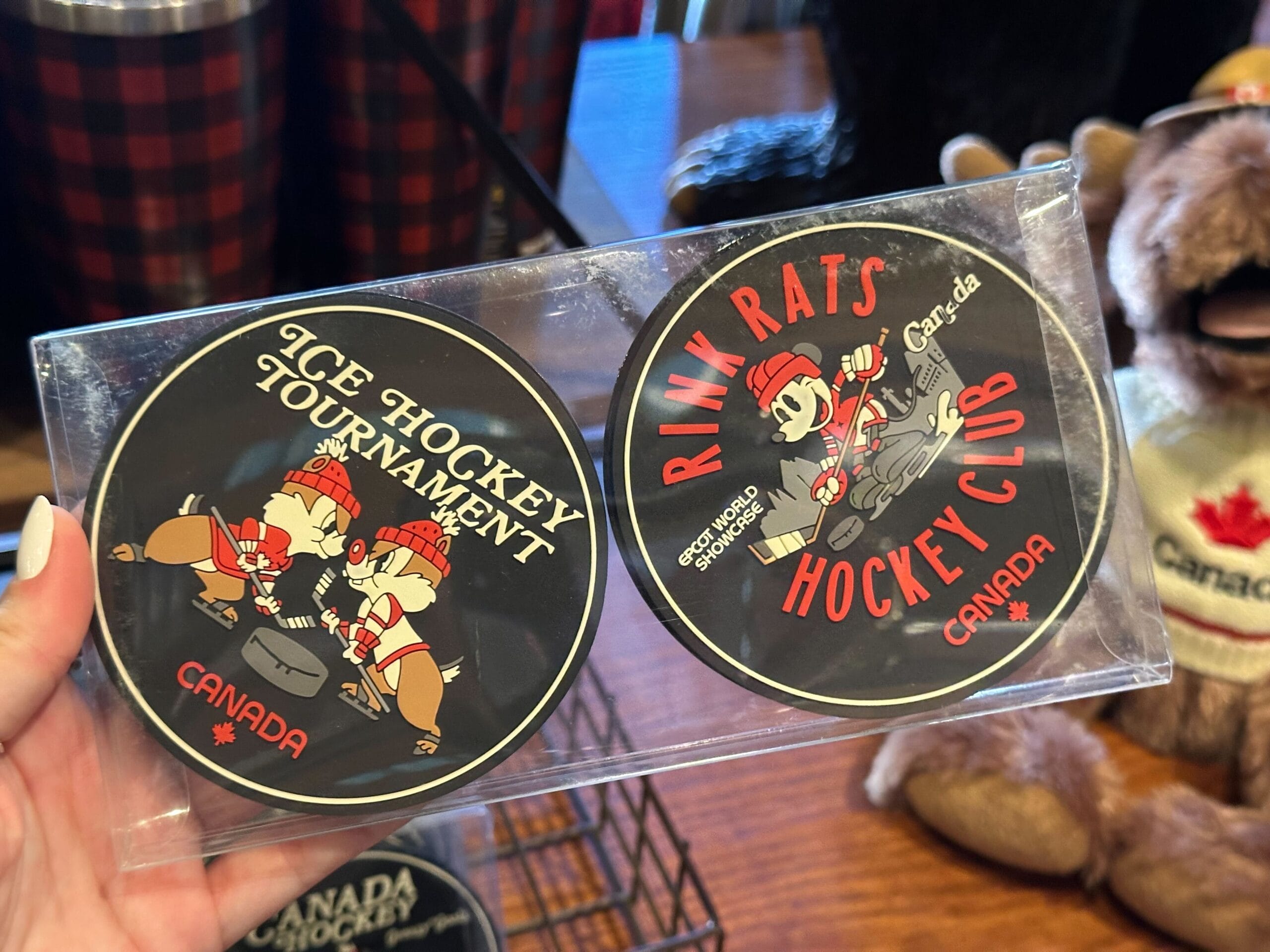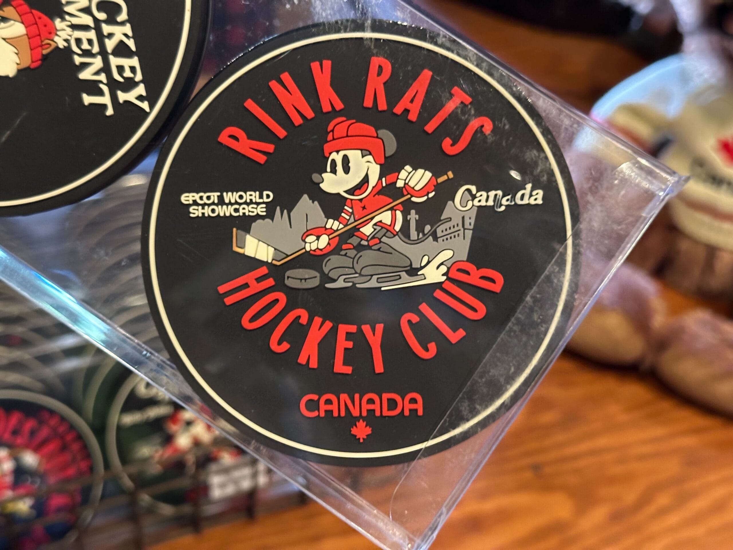 Another coaster features a design similar to the mug, with Mickey representing the Rink Rats Hockey Club. The background features the skyline of the Canada Pavilion. “EPCOT World Showcase” and “Canada” are in white text to the sides.