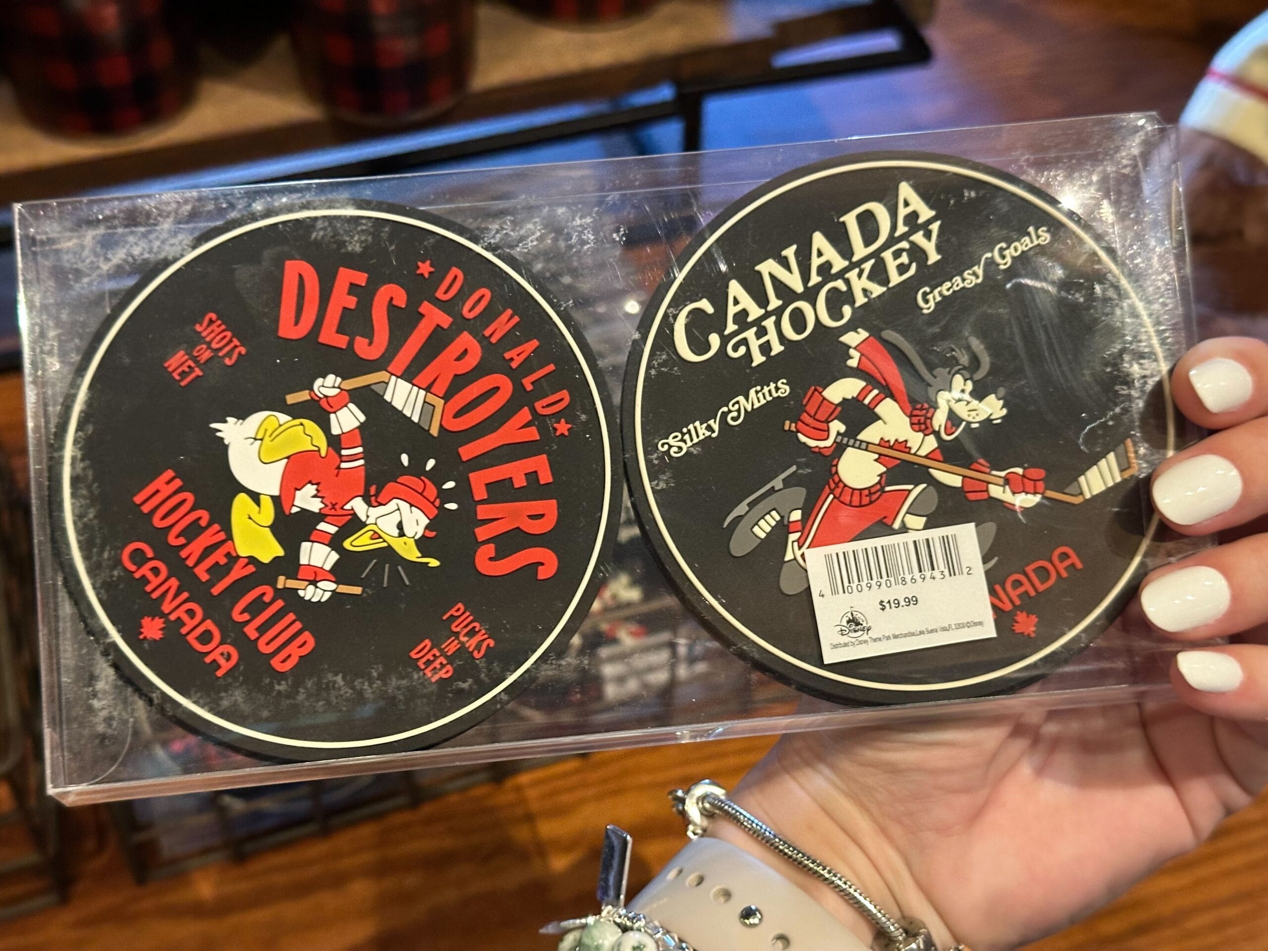 Goofy’s coaster reads “Canada Hockey,” “Silky Mitts,” and “Greasy Goals” in white text.