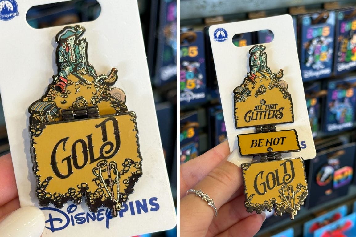 This pin features the pirate skeleton seen in Dead Man’s Cove at the start of the original attraction at Disneyland Park, surrounded by mountains of treasure and plundered goods. The pin unfolds into three hinged pieces, each piece a part of a warning that “all that glitters be not gold.”