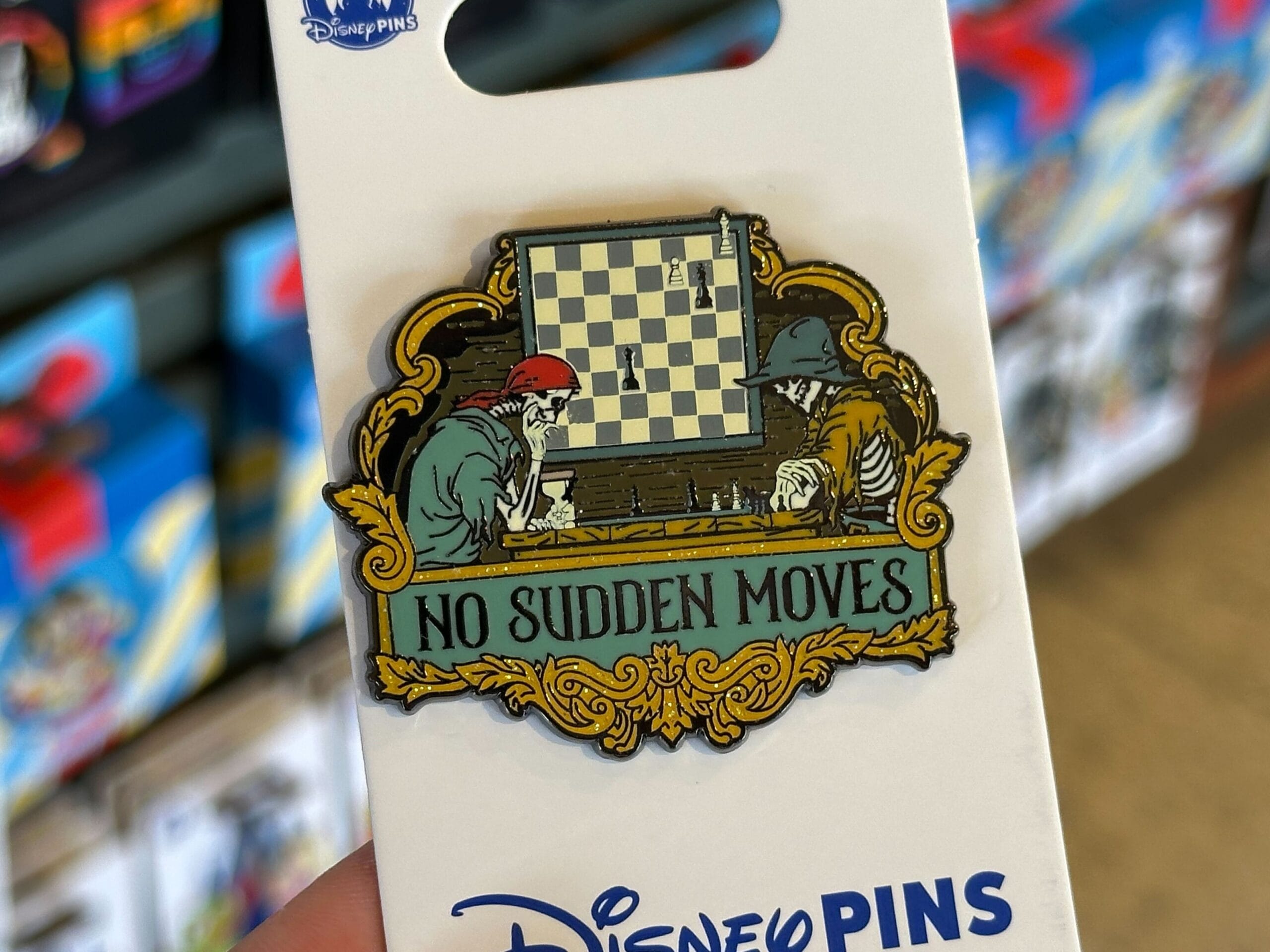This pin illustrates the board positions of a chess game poised to continue on forever, as strategically designed by Imagineer Marc Davis. The pirates have been playing this game for so long, that they have presumably turned into skeletons, and even their clothes are in tatters.