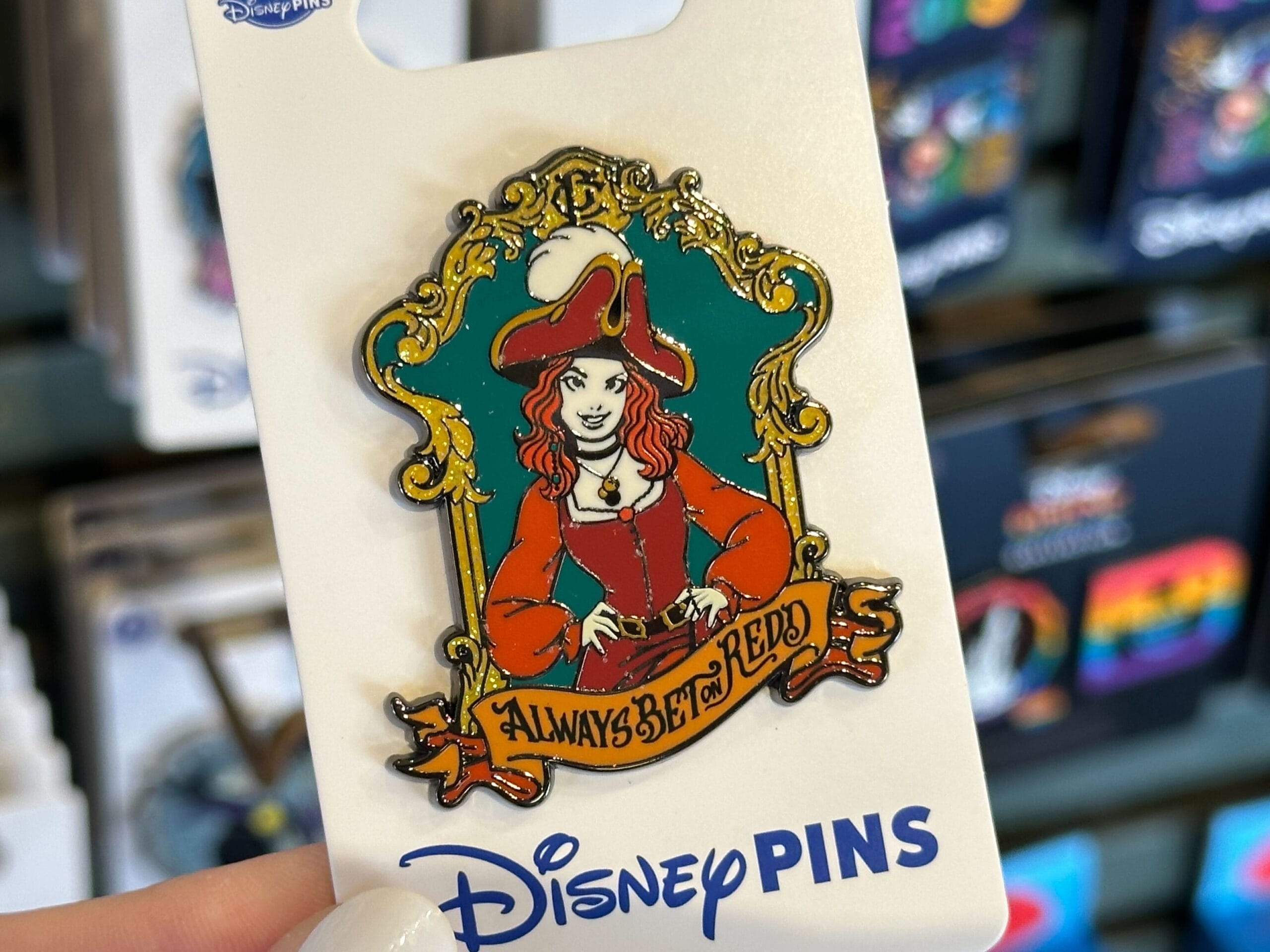 A framed portrait of Captain Redd in her typical garb and large-plumed hat atop her eponymous hair is featured on this pin. The phrase “Always Bet On Redd” is on a scroll along the bottom of the glittery yellow frame.