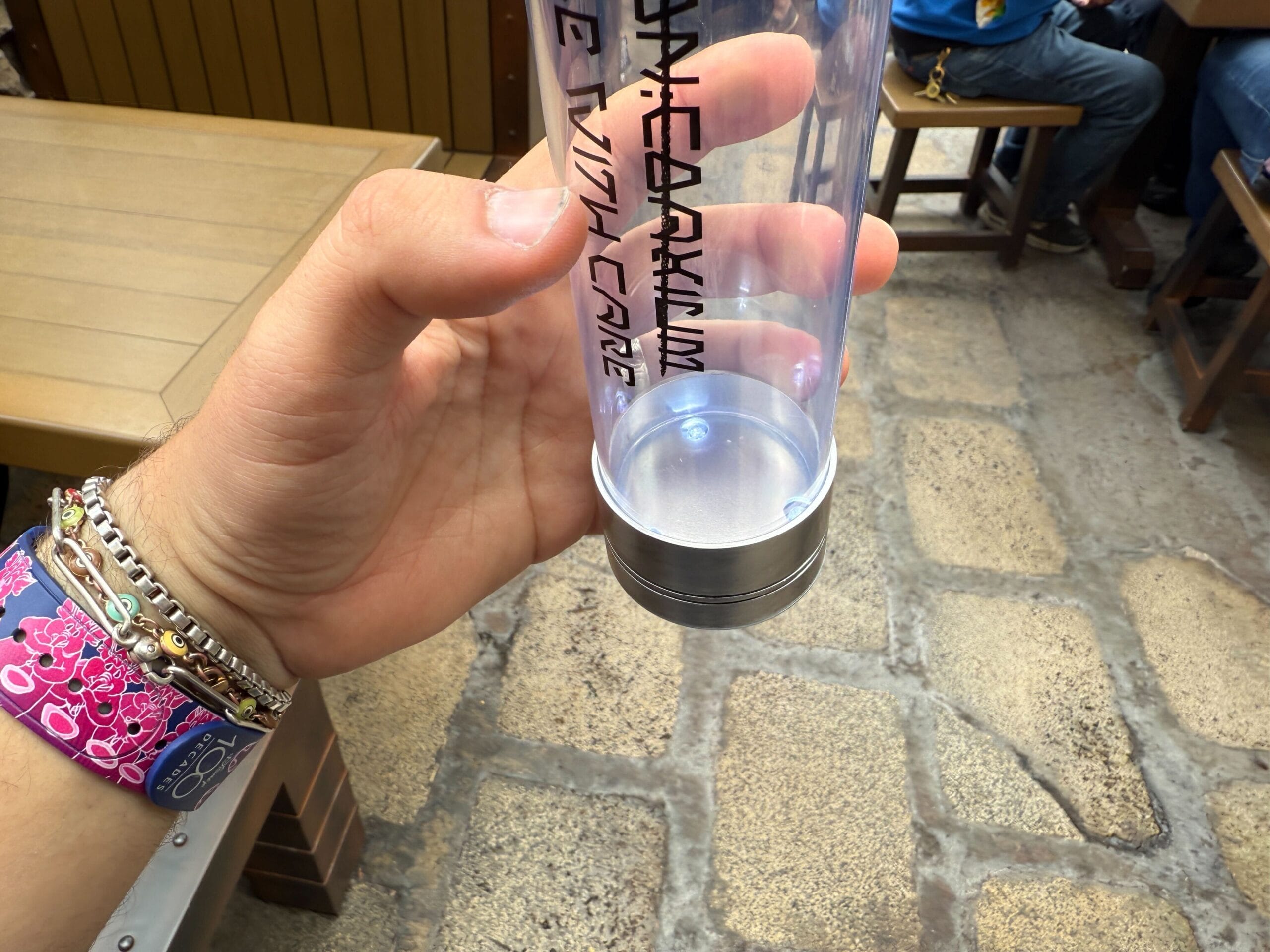 This is a light-up transparent tube with silver ends. The lettering on the side looks like Aurebesh but is actually English reading, “Caution: Coaxium, handle with care.”