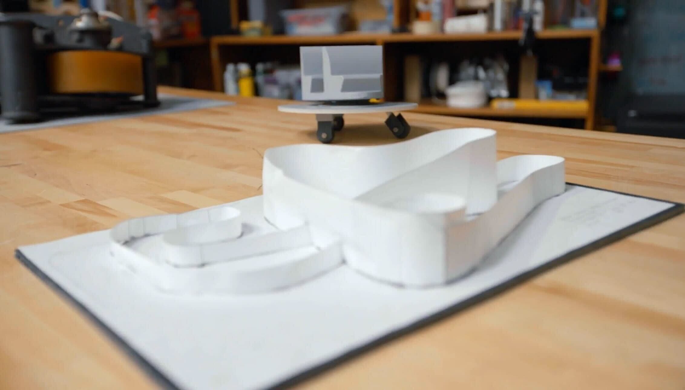A white architectural model with curved features rests elegantly on a wooden table, reminiscent of the enchanting design of Magic Kingdom. In the background, a small wheeled object hints at the thrilling track layout of an exciting Cars Ride.
