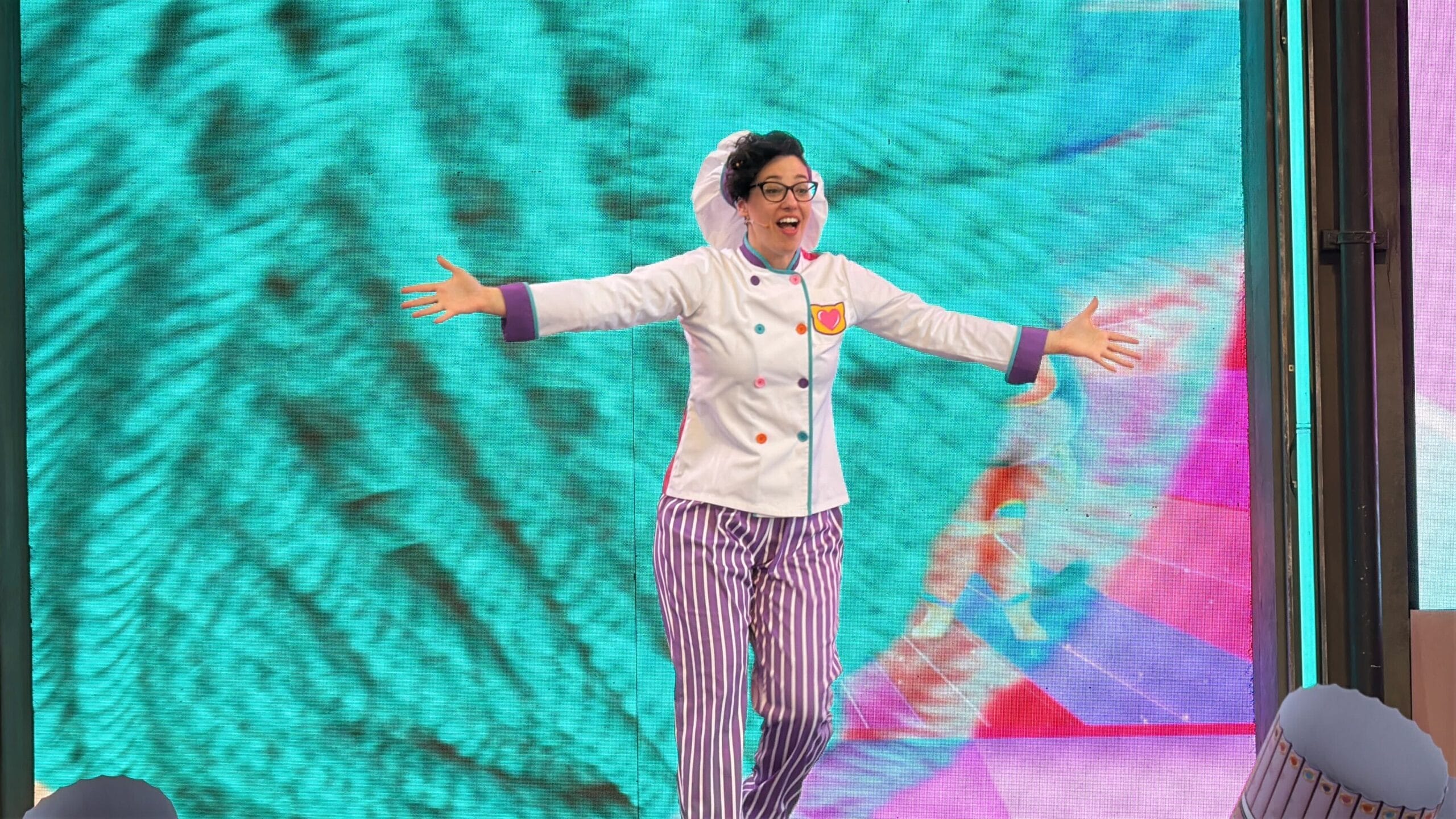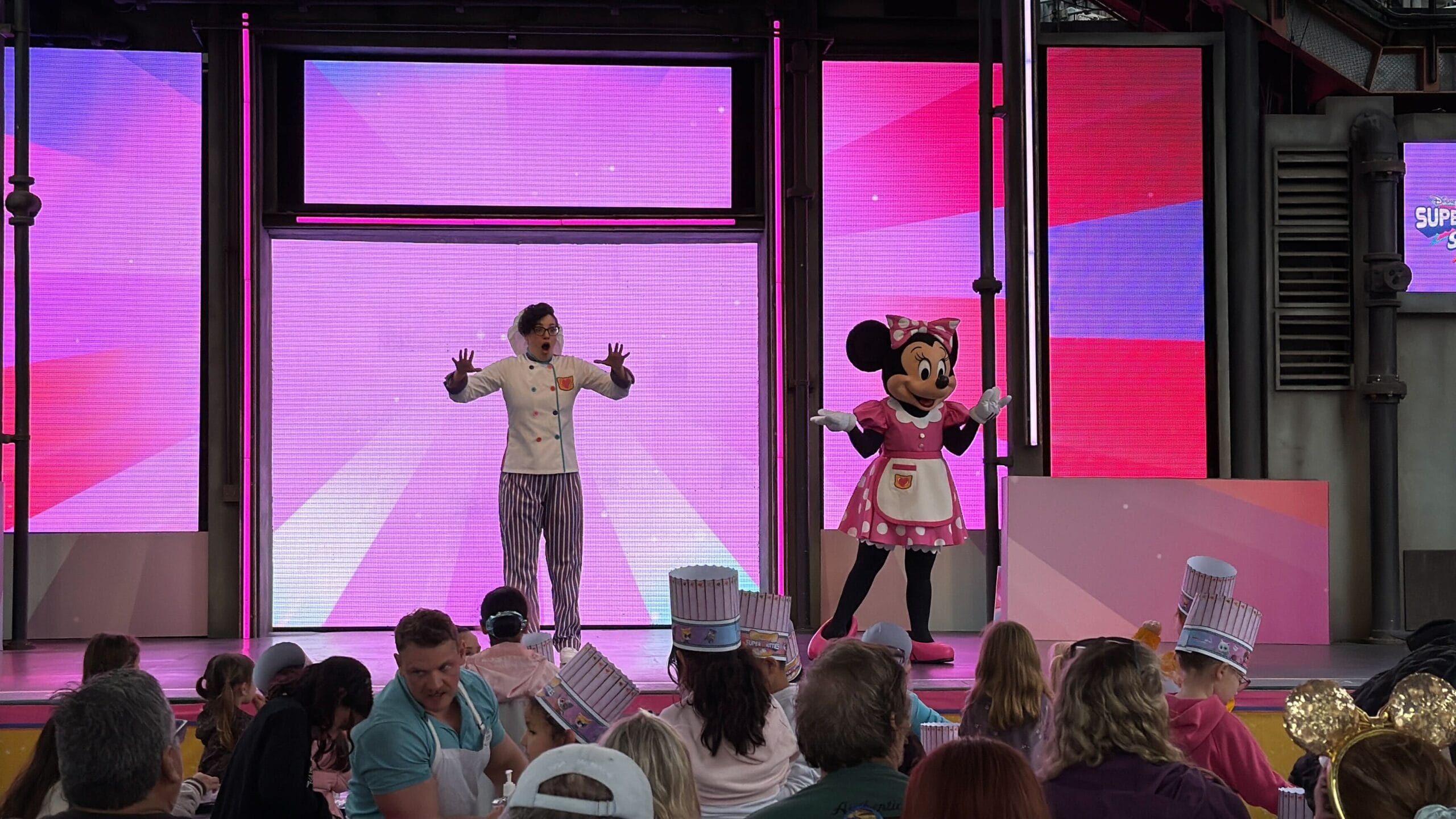 Character in a pink polka dot dress and bow, waving on a stage with a large screen in the background. Audience heads visible at the bottom.