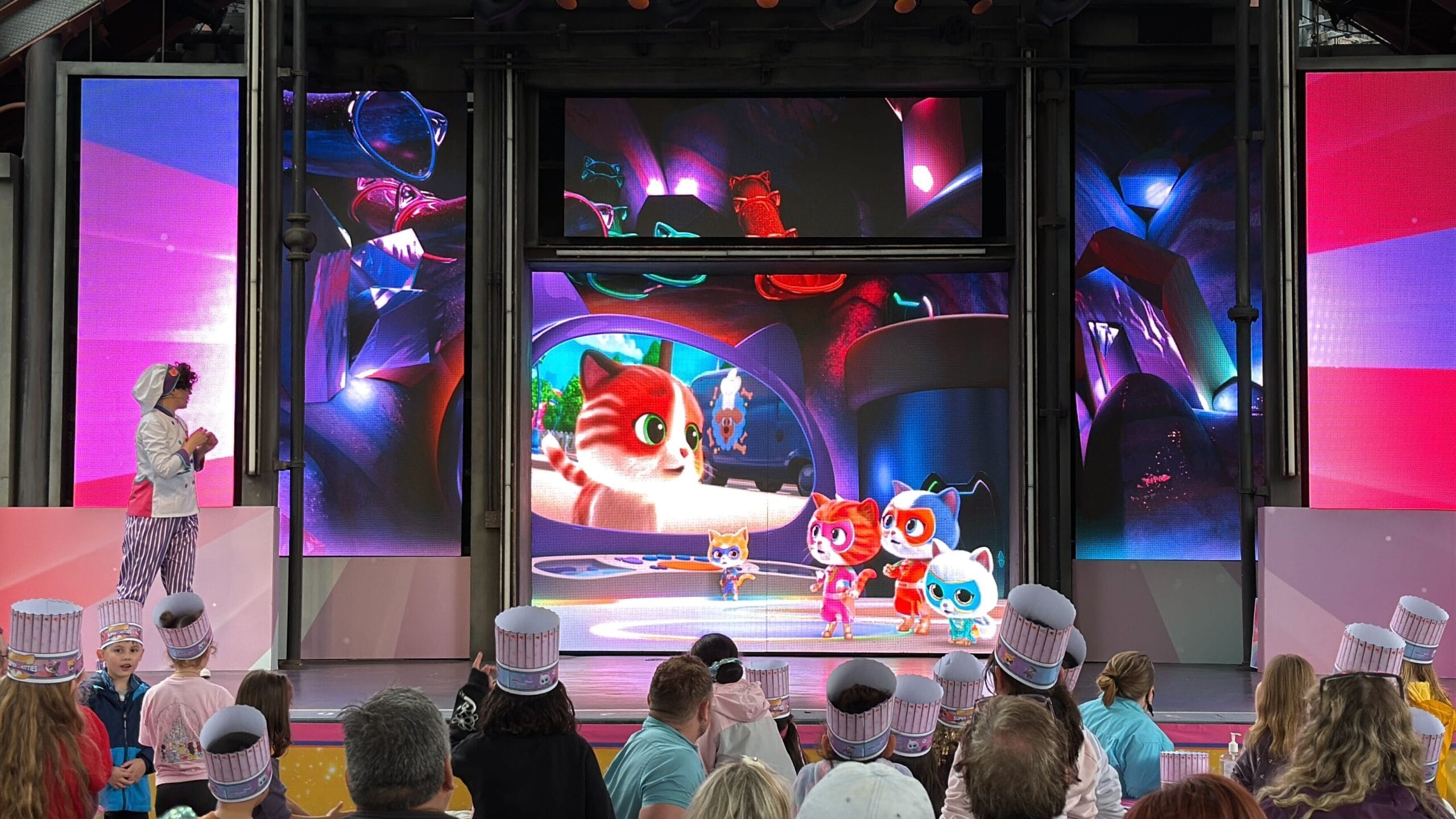 Colorful animated cat characters are displayed on a large screen during a live event, with a performer on stage and an audience wearing themed hats.