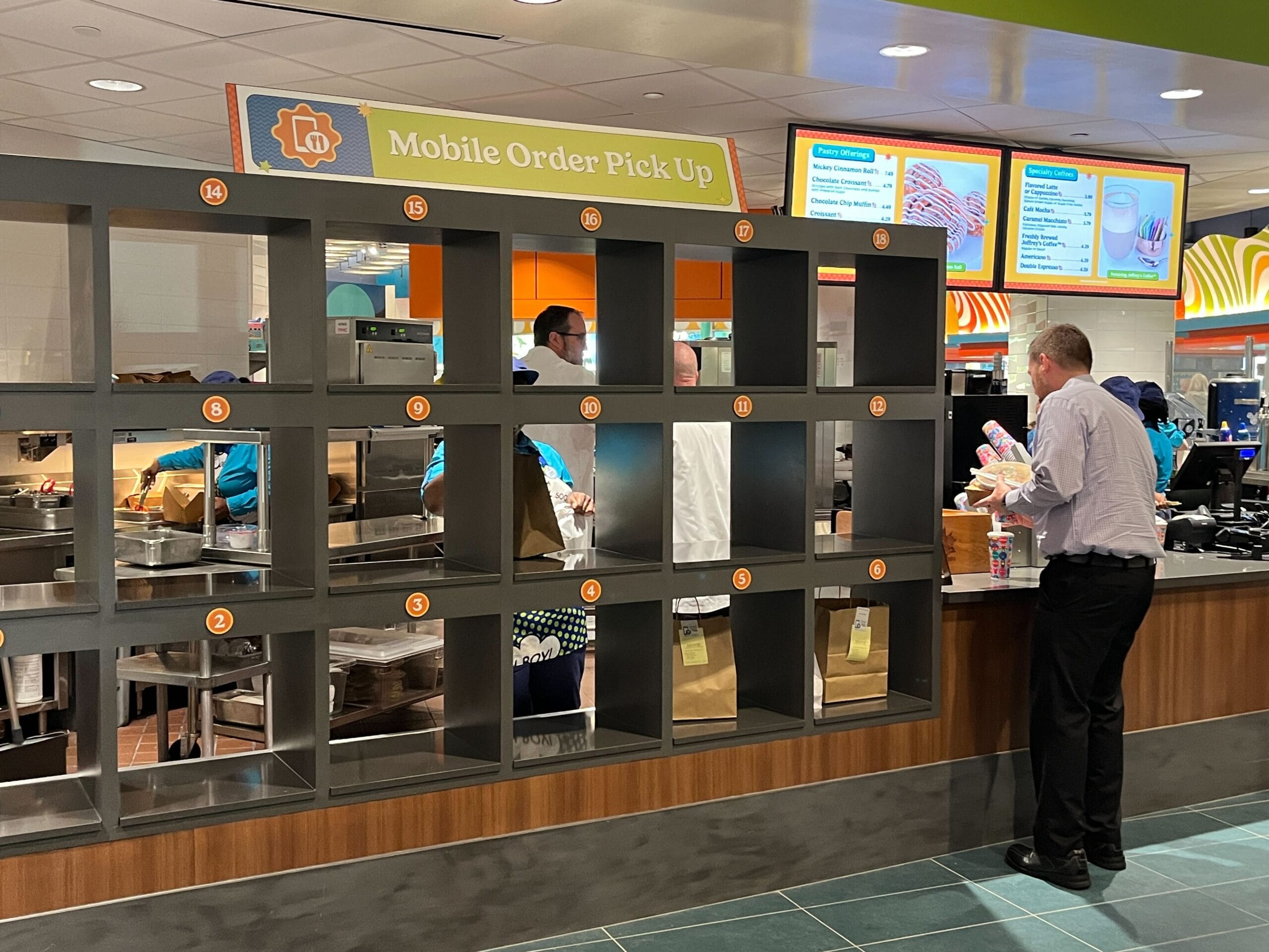 The cubbies next to the cash register are for mobile pick-up. Cast Members prepare an order, put it in a paper bag, and then place it in a cubby. Guests will see their cubby number in the My Disney Experience app when their order is ready.