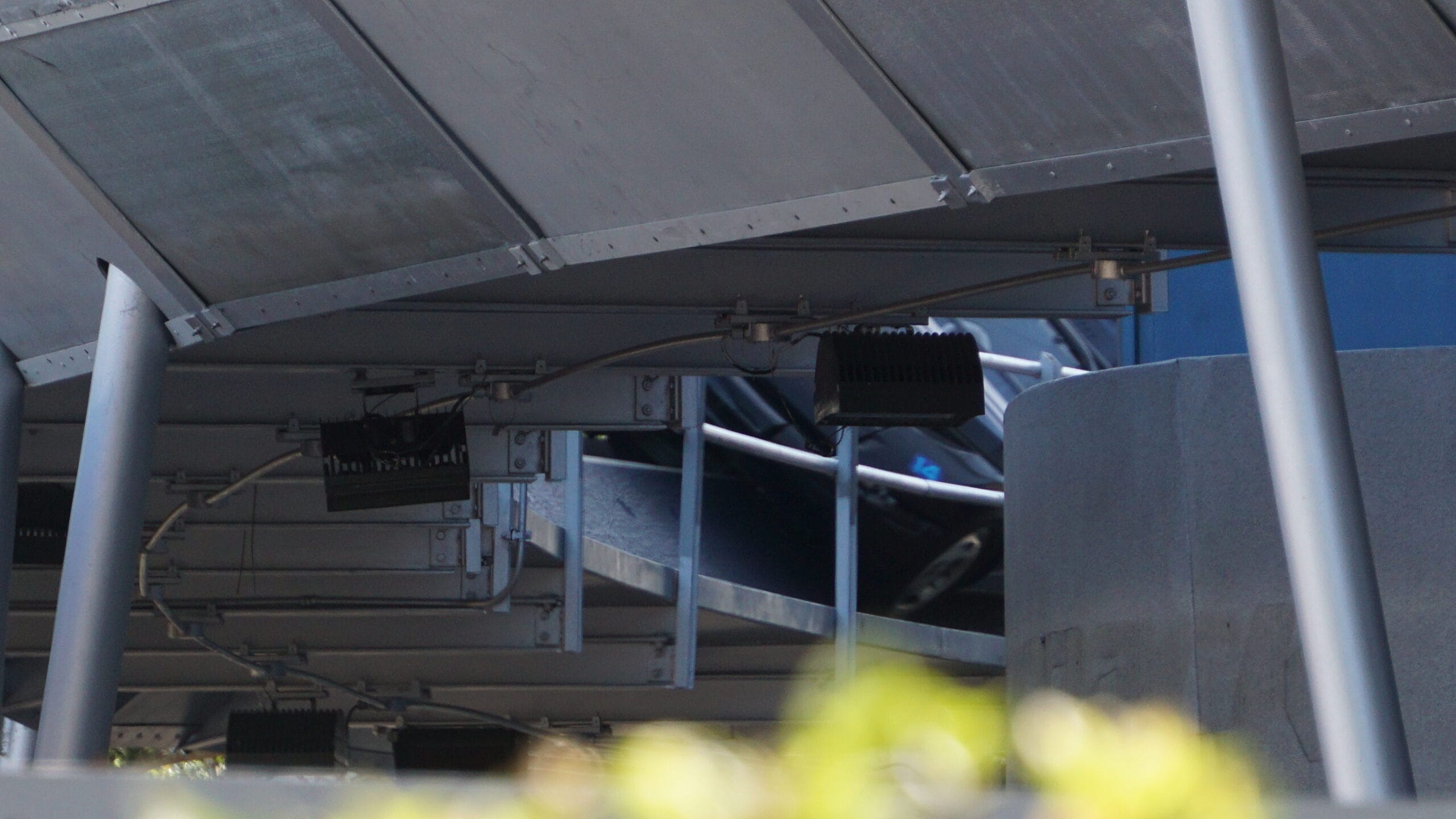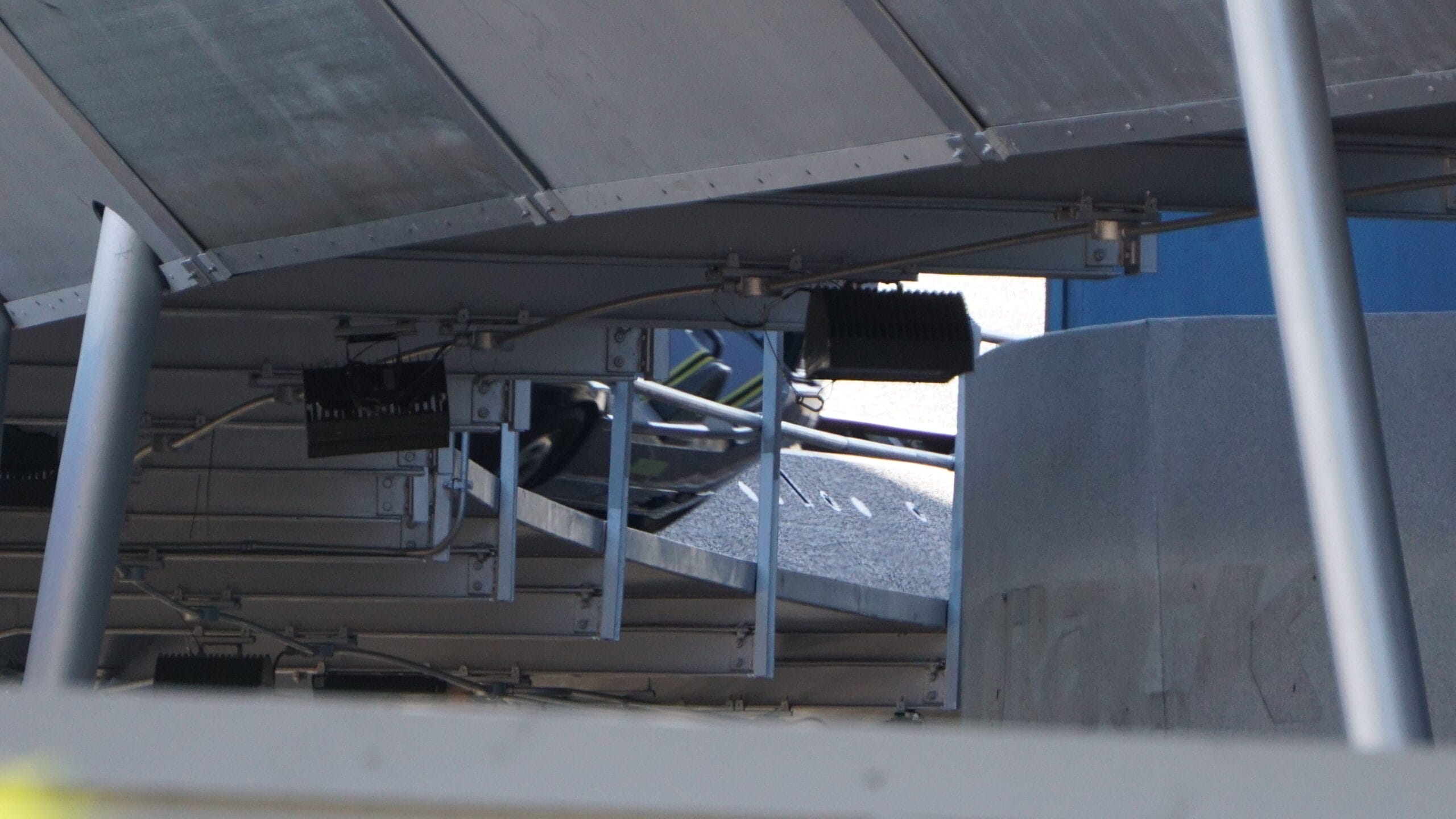 Close-up of a metallic structure under a larger framework, featuring cables, lights, and a sloped surface.