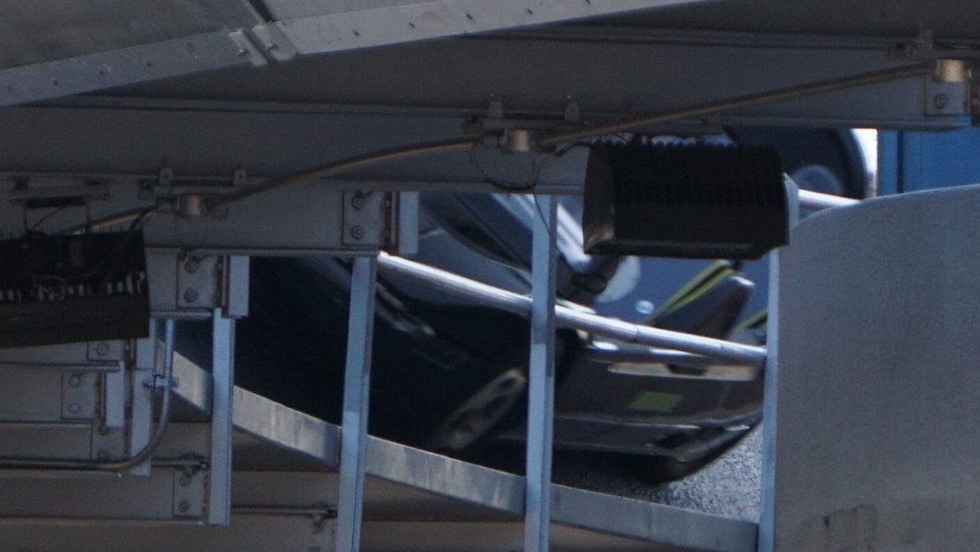A car is partially visible under a metal structure, with its front peeking out near a concrete pillar and cables overhead.