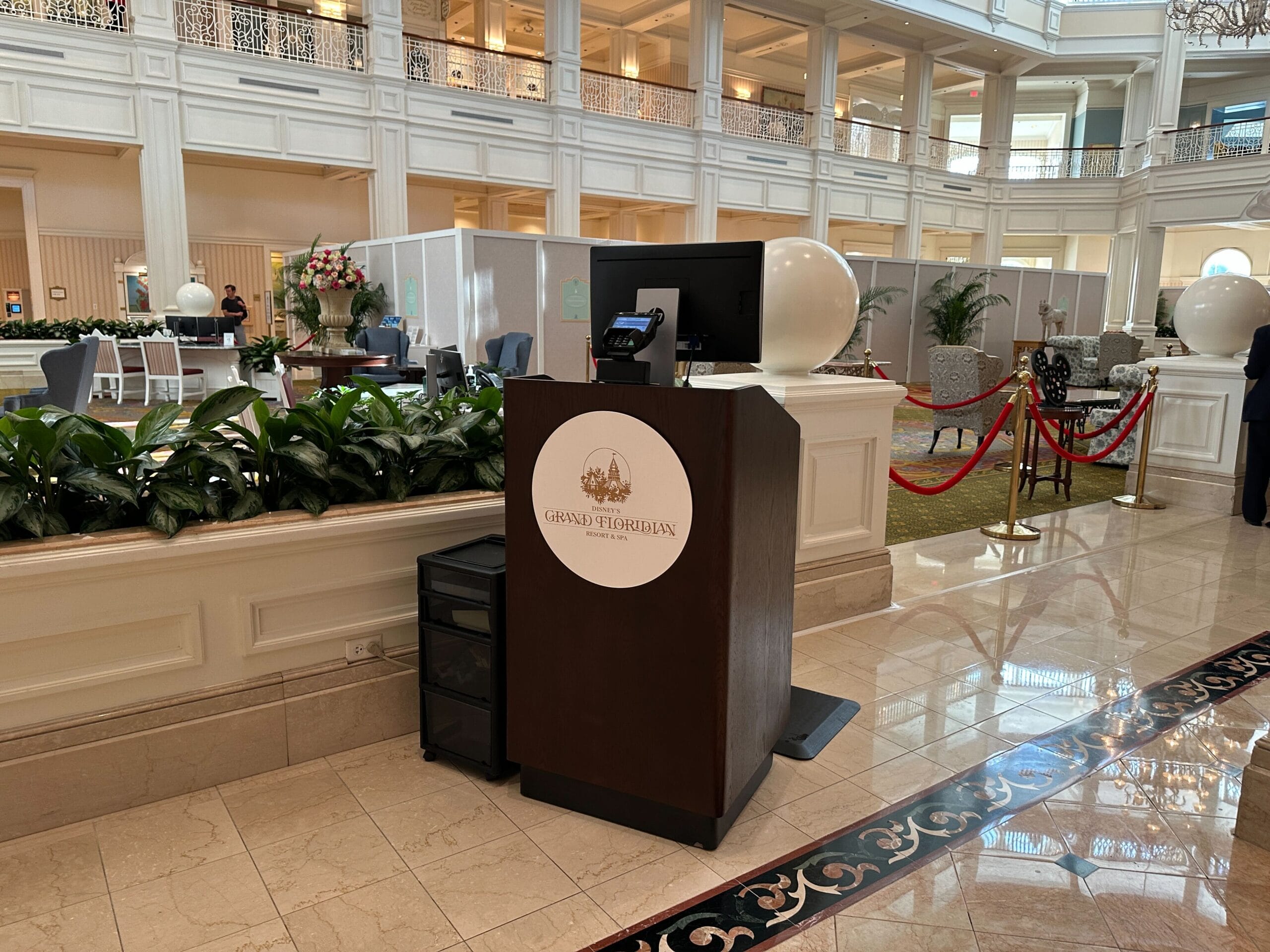 Two desks with chairs have been set up in the seating area to act as check-in for now. The space is blocked by red ropes, but Cast Members with tablets will help guests check in. If they need to use the computer, they’ll go to one of the desks.