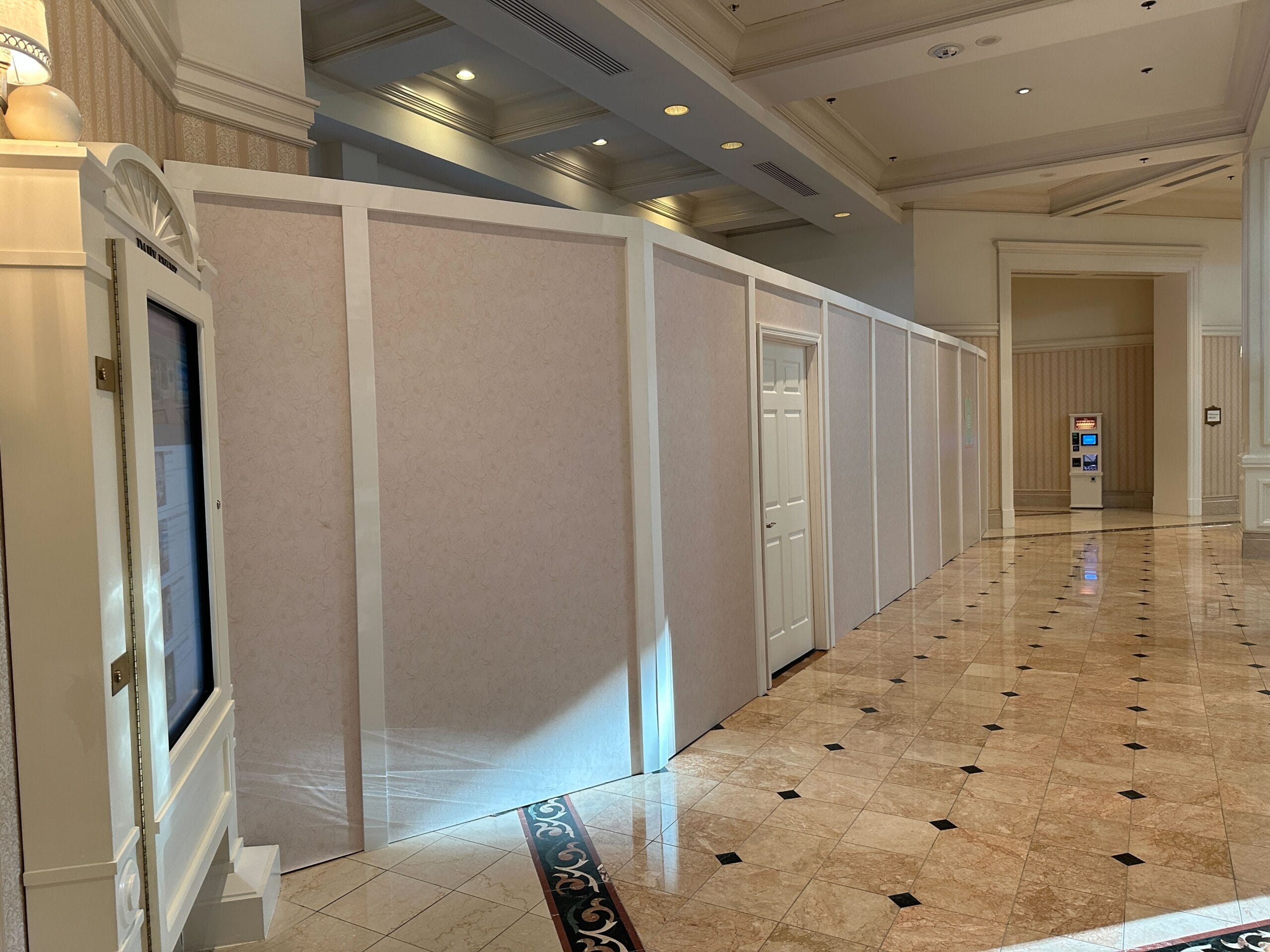 A white temporary wall with a closed door runs through a polished hallway with tiled floors and decorative ceilings.
