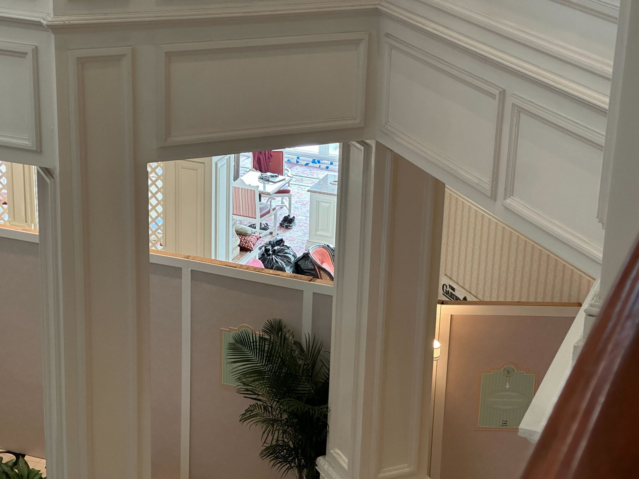 Behind the walls, we saw crew members working already. A ladder was set up against one window. Some blue painter’s tape covers wall elements.