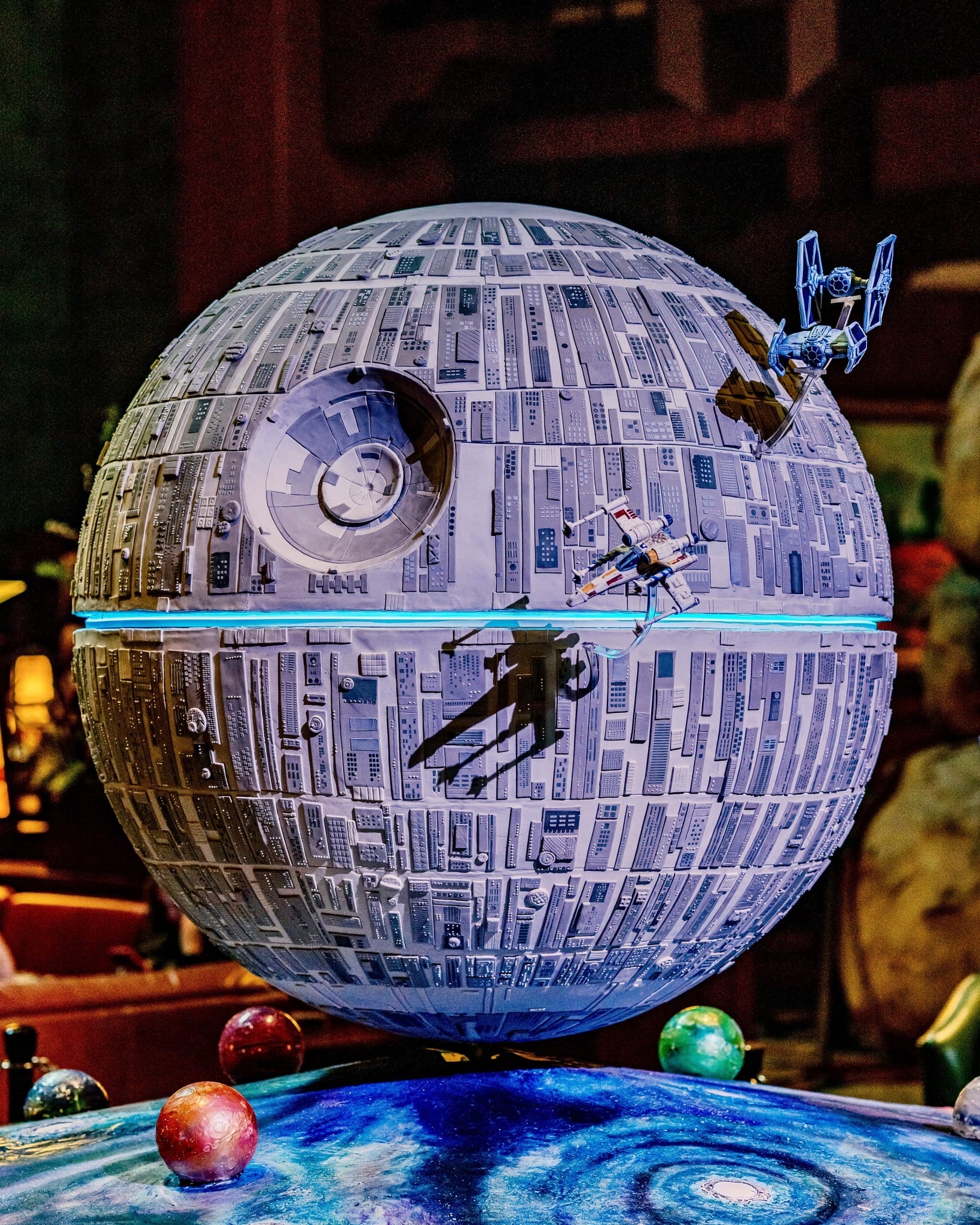 The detailed confection is on display in the Grand Californian lobby. It includes a “flying” X-Wing being chased by two TIE Fighters. The base is designed to look like space with planets and other celestial bodies.