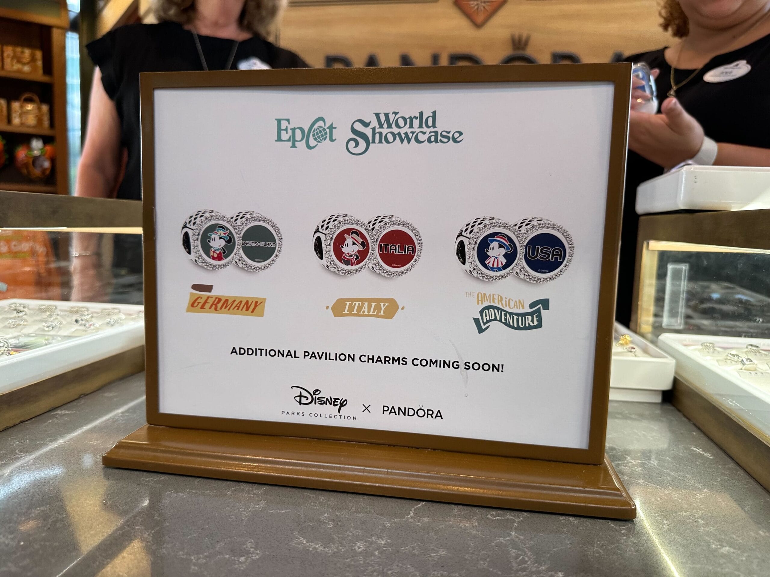 A display features Epcot World Showcase charms for Germany, Italy, American Adventure, by Disney x Pandora. Two people stand behind the display.