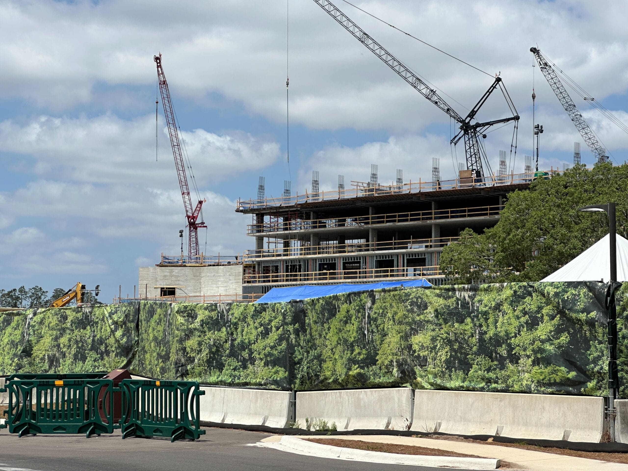 A multi-story building under construction with cranes, behind a green fence decorated with tree images.