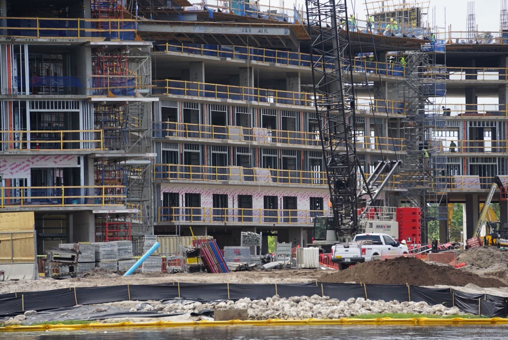 A multi-story building under construction with workers, vehicles, and equipment on site near a body of water.