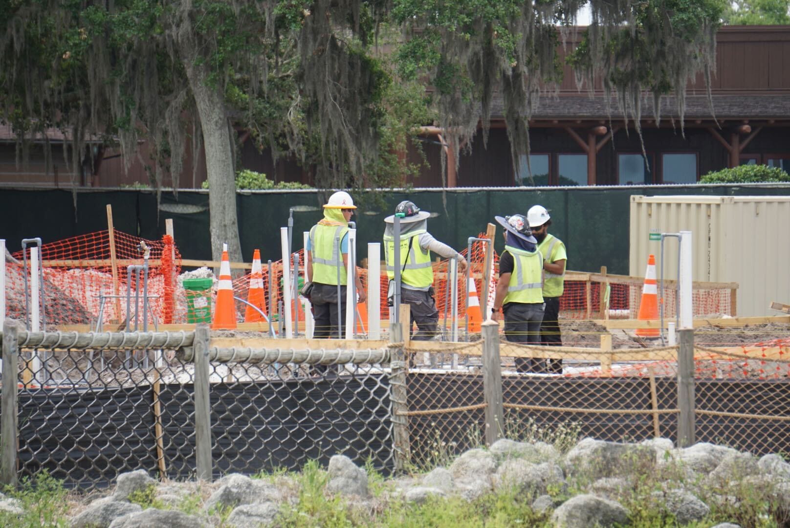 Among some of the white poles are gray pipes. There were crew members having a discussion at the end of the beach closest to Fort Wilderness.