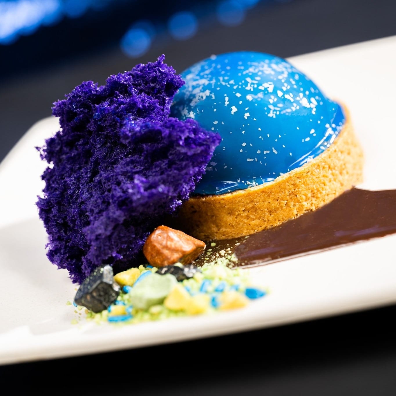 The Cerulean Moon is a chocolate mousse dome with strawberry filling on a graham cracker tart with a hibiscus sponge, green space dust, and chocolate-caramel sauce.