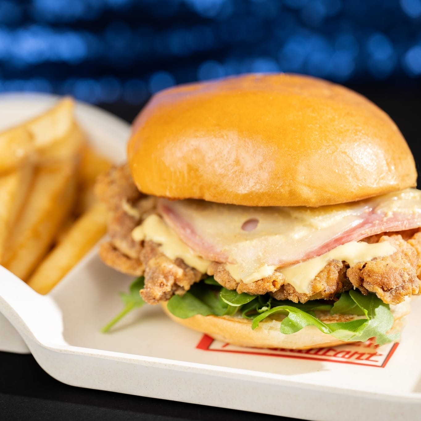 Close-up of a crispy chicken sandwich with lettuce, cheese, and ham in a brioche bun, served on a white plate with fries in the background.