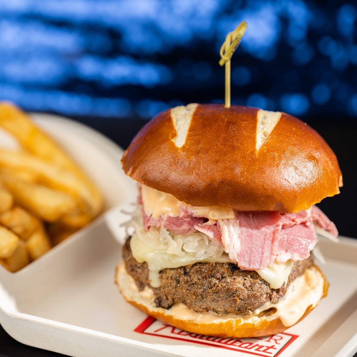 Close-up of a burger in a pretzel bun with corned beef, sauerkraut, and sauce, served on a tray with a side of fries.