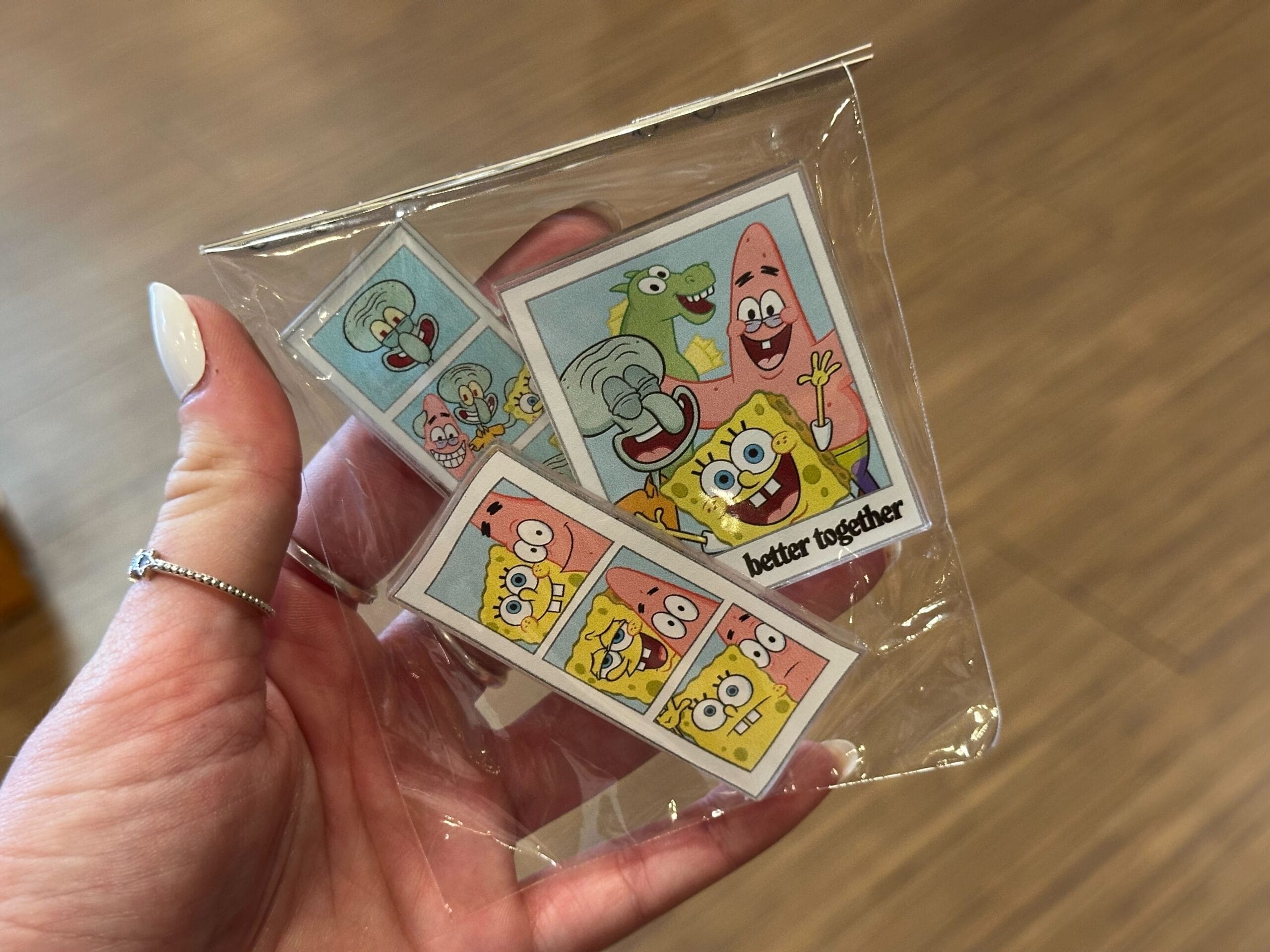 This magnet resembles two strips of pictures from a photobooth and a polaroid piled on top of each other. One strip of pictures features SpongeBob and Patrick making different expressions. Squidward is in the other strip of pictures. All three of them and Mystery the seahorse are in the larger polaroid, which has “better together” at the bottom.