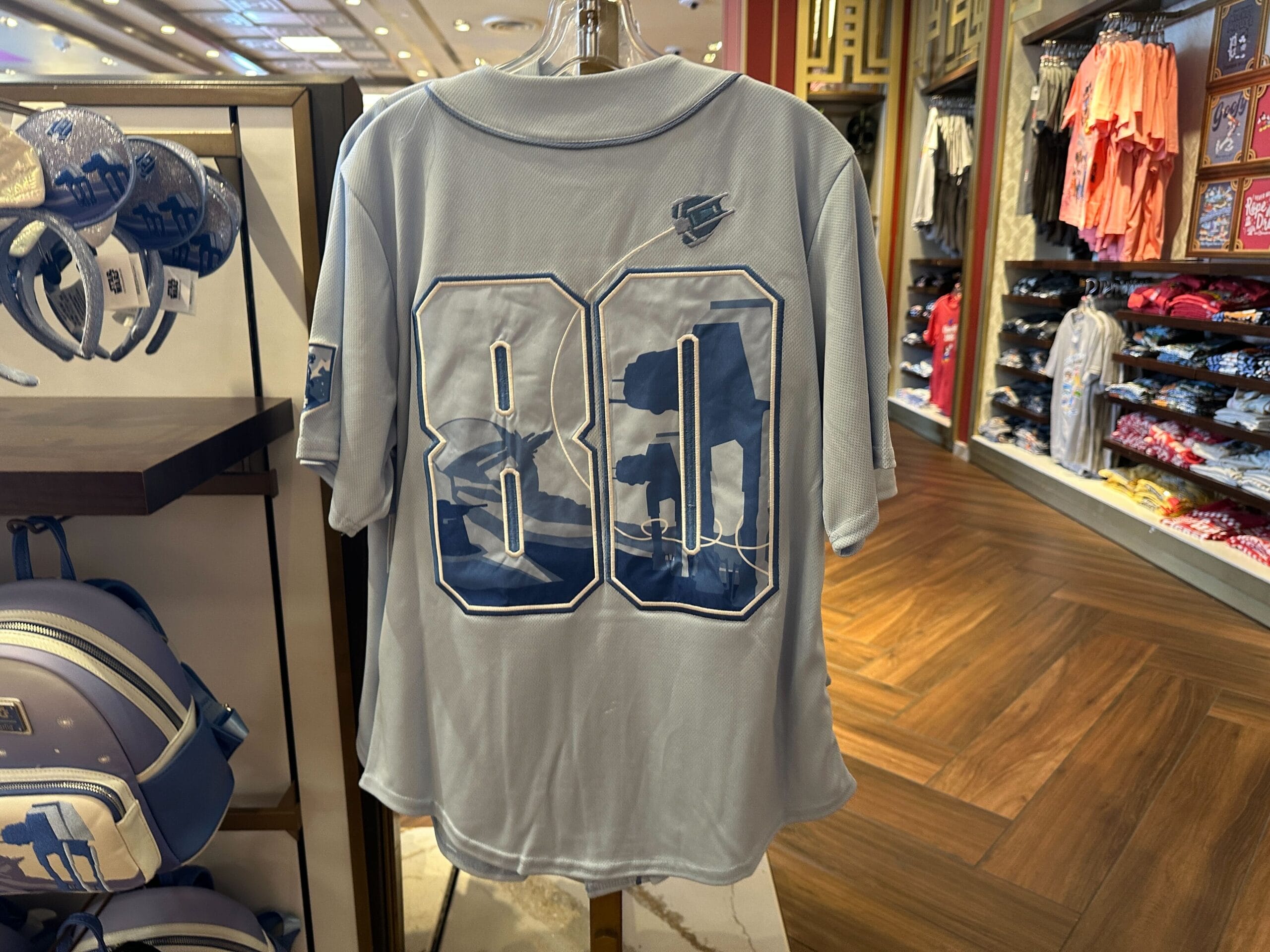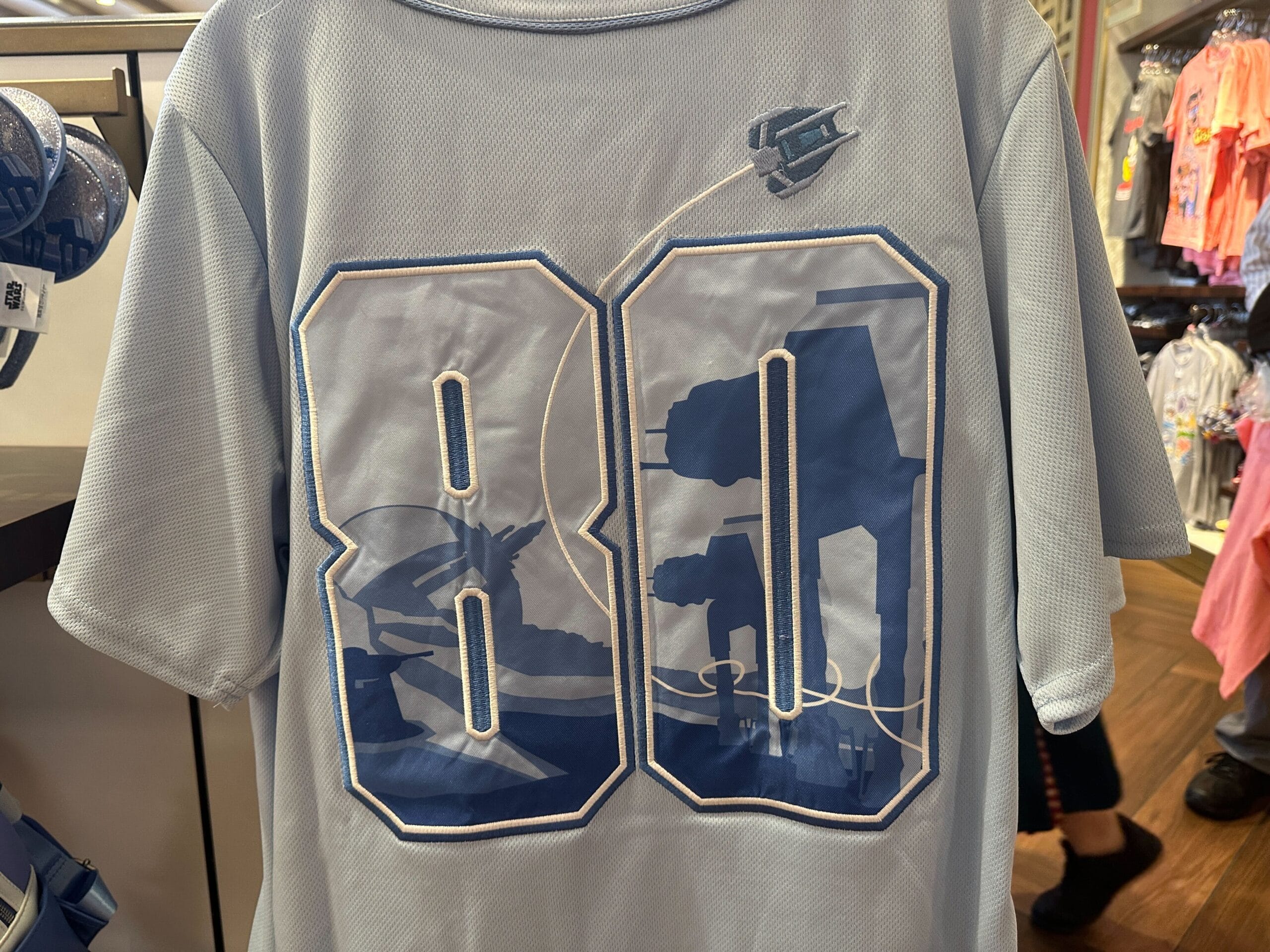 “80” is on the back of the jersey, representing the 1980 release of “The Empire Strikes Back.” Pictured within the numbers are elements of the Rebellion’s battle against the Empire. The round structure in the background is the Rebellion’s ion cannon. A ground cannon is in the foreground, pointed at the silhouettes of two Imperial AT-ATs.