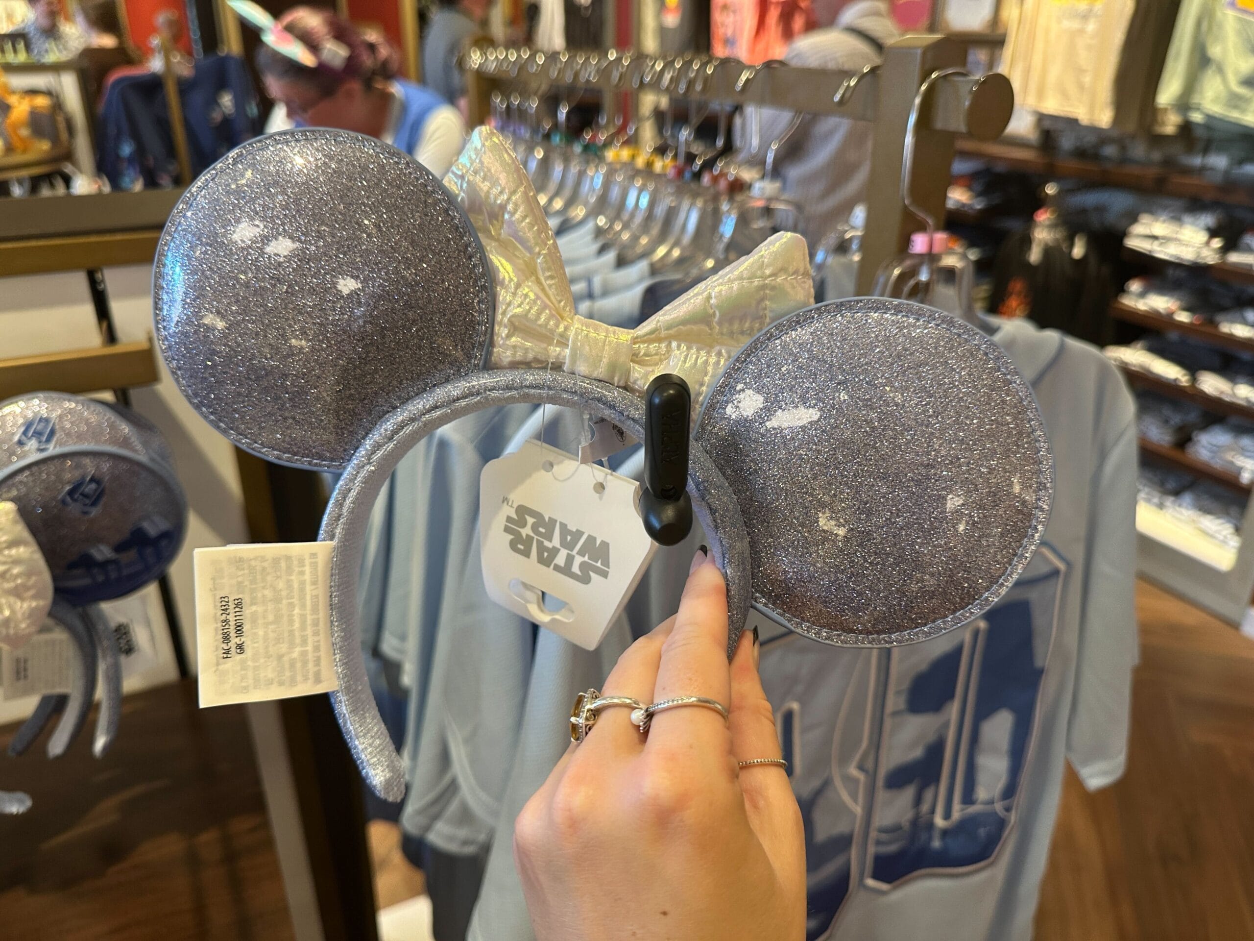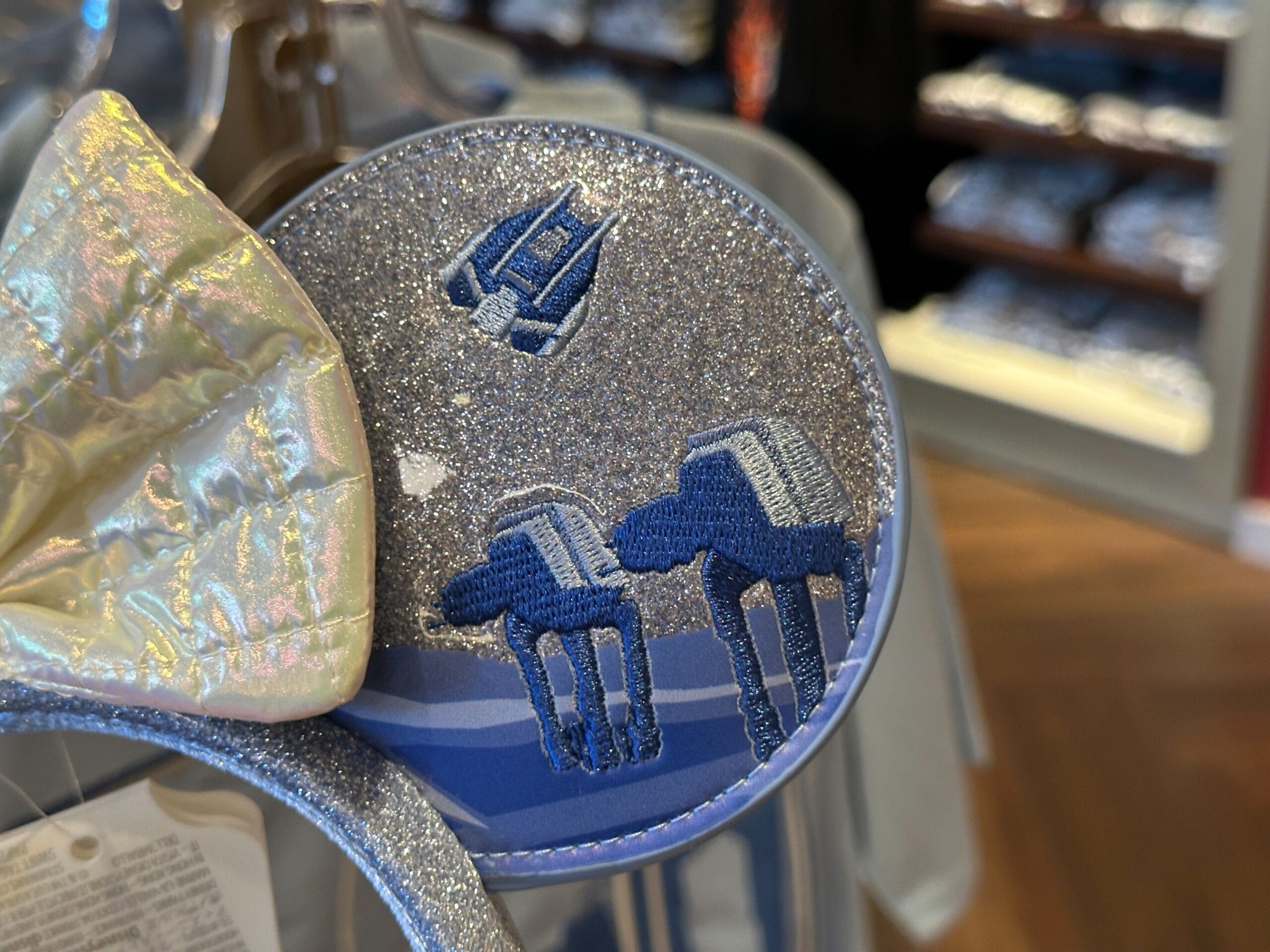 The ears and headband are covered in sparkly silver pleather. The white bow between the ears is shiny with stitching that makes it resemble a puffer jacket or vest like those worn by the Rebel Alliance, most notably Princess Leia.