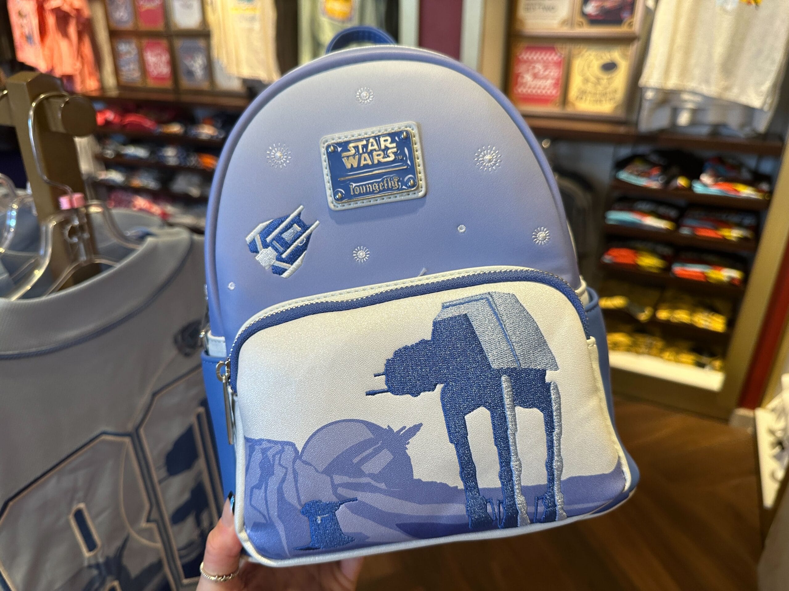 The backpack is mostly blue with a slight gradient to white. The front pocket is white with a image printed image of the ion cannon and embroidered images of the ground cannon and AT-AT. Luke’s speeder is embroidered above the pocket, next to the blue “Star Wars” | Loungefly label plate. White snowflakes are embroidered across the front of the bag.