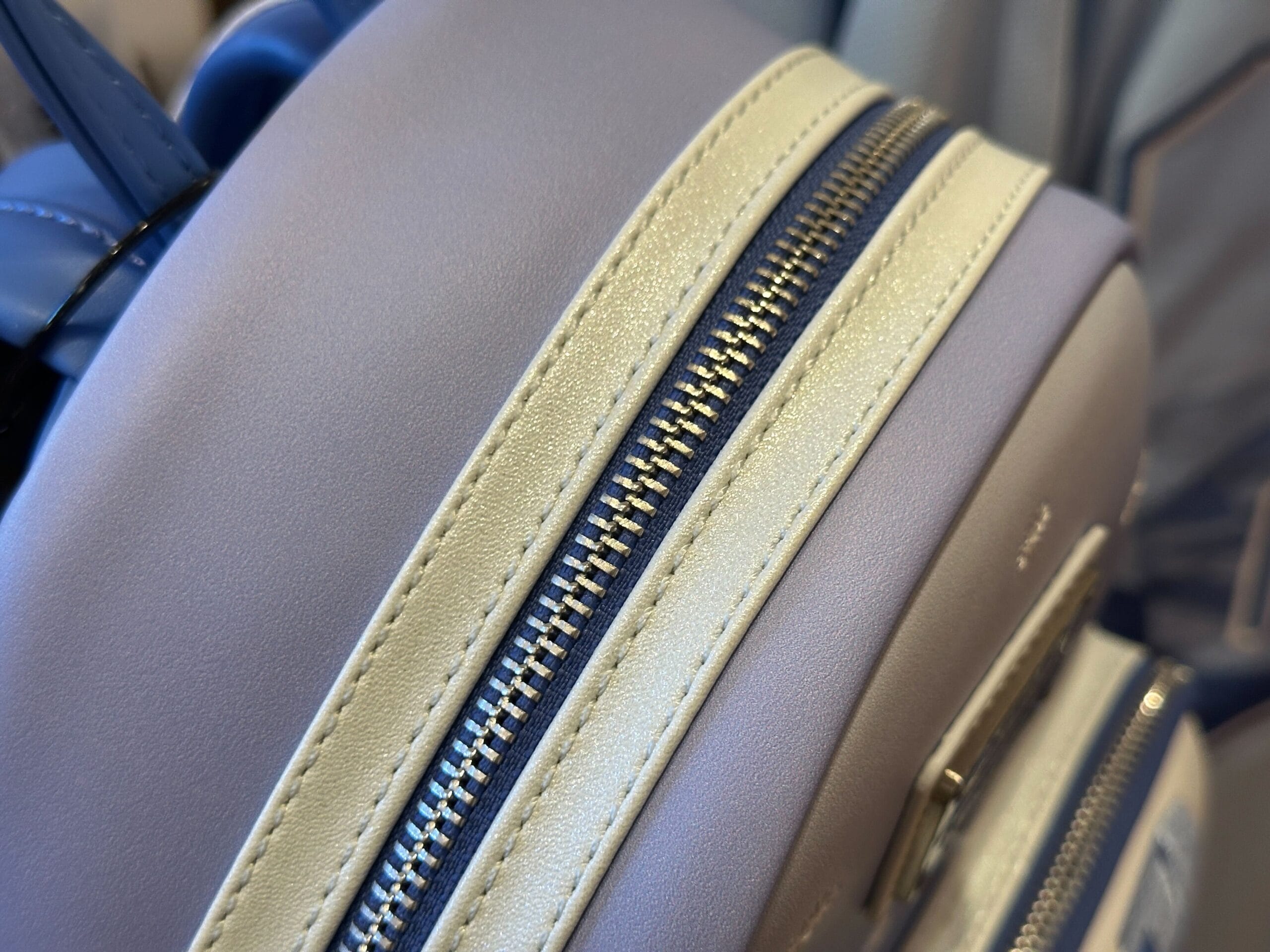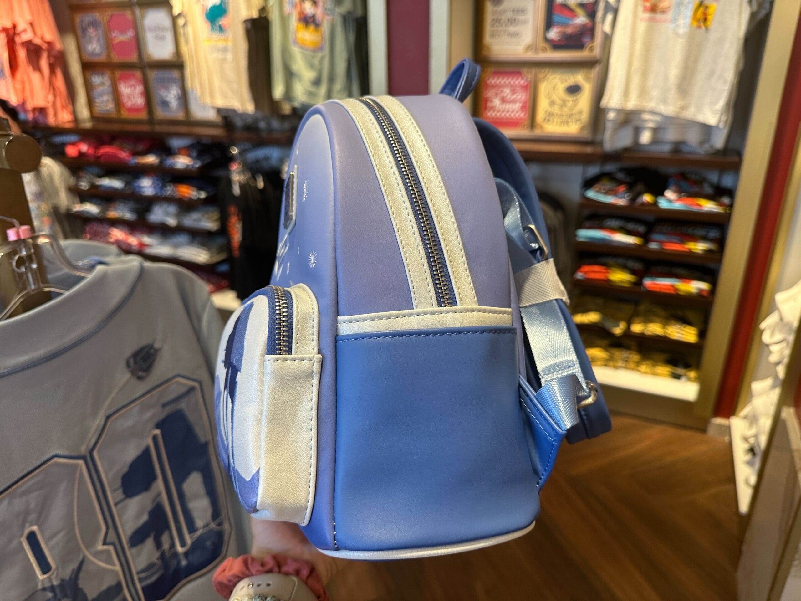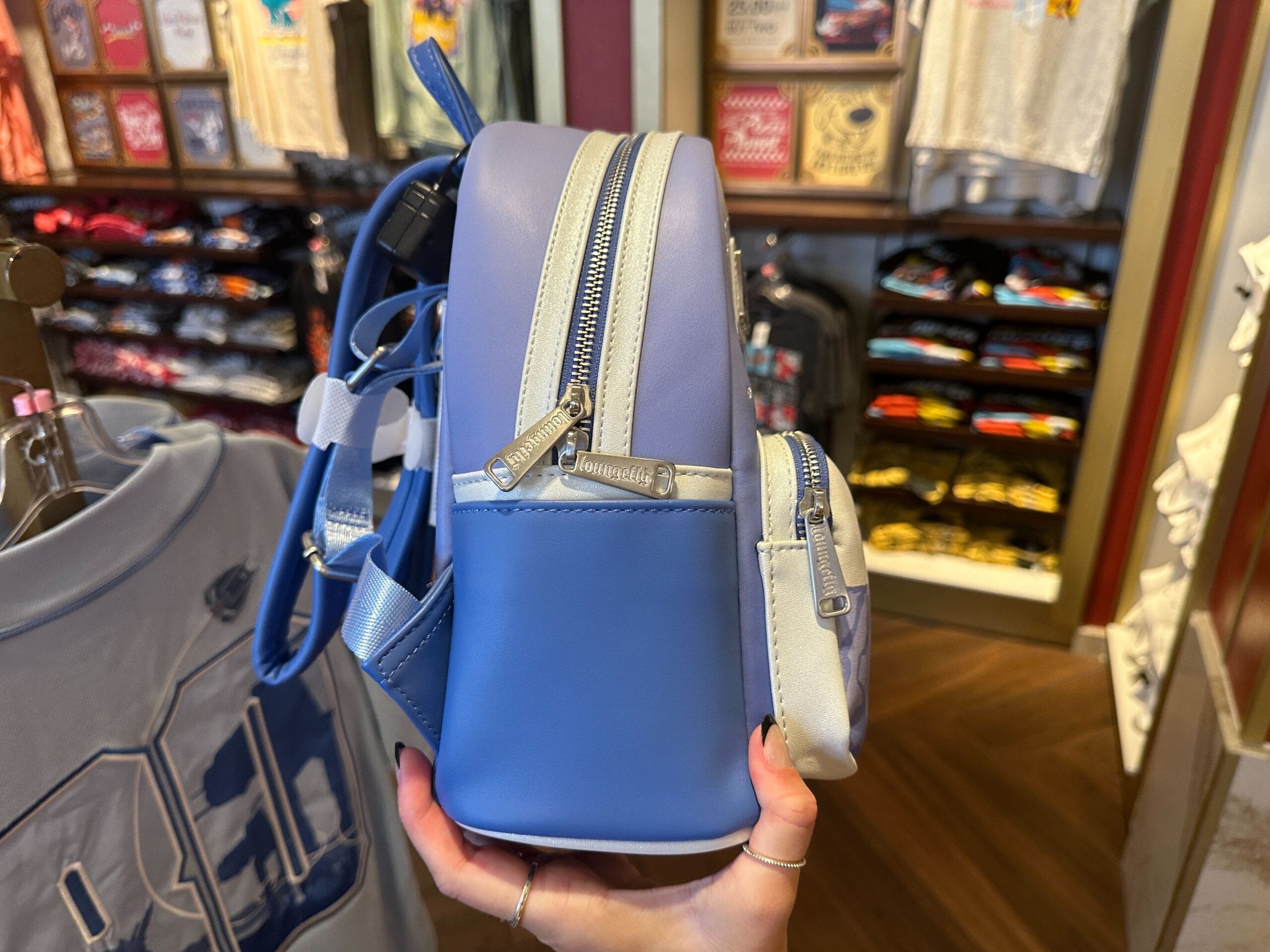 Silver-white trim is around the main compartment’s zipper. Both zippers are silver-tone with Loungefly pulls. There are two side slip pockets.