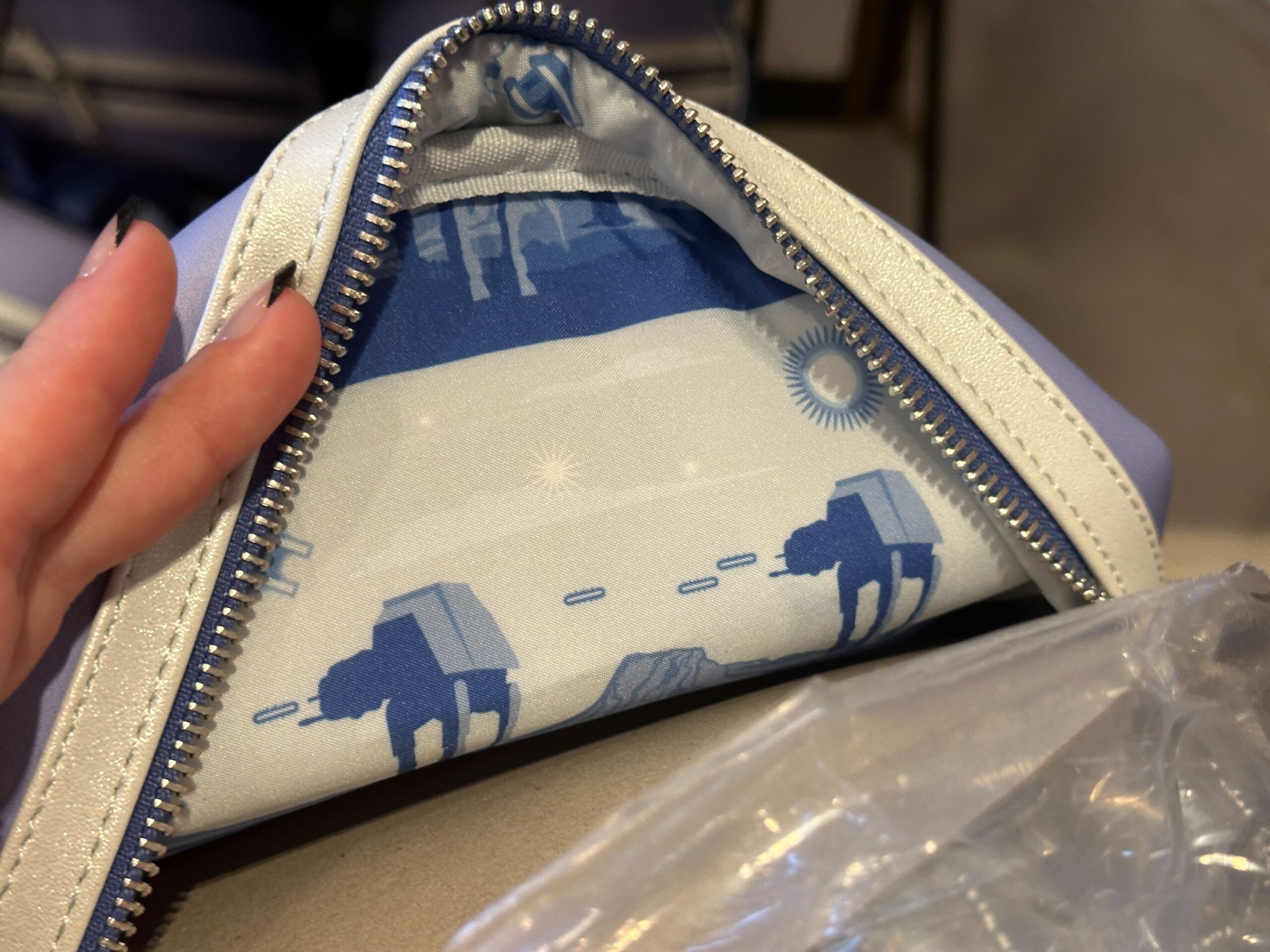The interior lining features the AT-ATs and Luke’s speeder against a white and blue background.