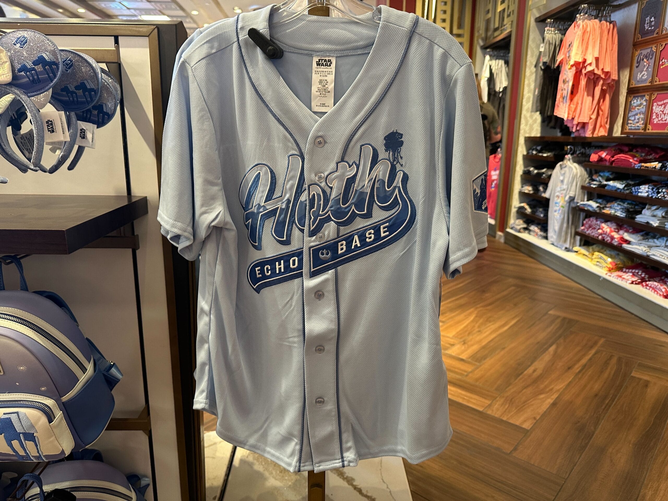 The jersey is light blue with dark blue piping down the front. “Hoth” is across the chest in large letters with white embroidered borders. Pictured in the letters is the planet’s snowy, mountainous landscape. The end of the “h” curls down as an underline with the words “Echo Base” and the Rebel Alliance symbol. The Empire’s Viper probe droid is pictured in dark blue next to the planet’s name.