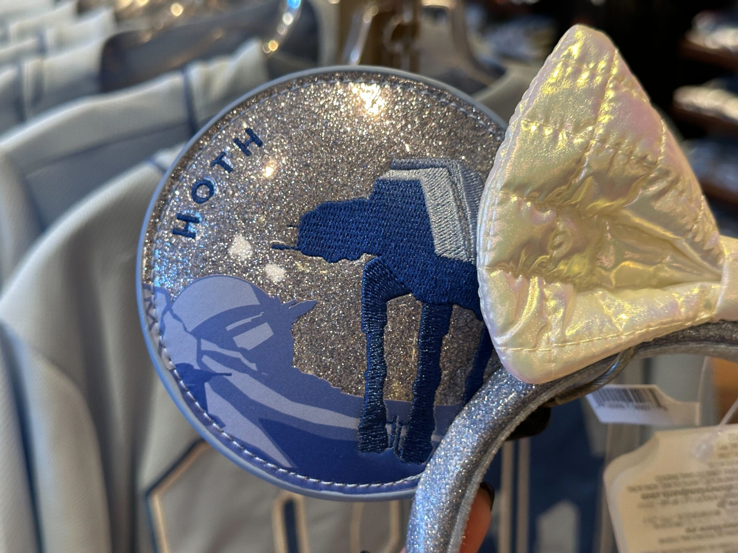 On one ear is the blue printed image of Echo Base’s ion and ground cannons. Embroidered towering over the base is an AT-AT and “Hoth” along the edge of the ear.