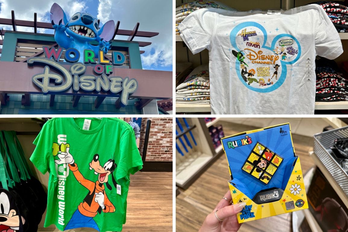 Collage of Disney merchandise from Disney Springs: top left shows World of Disney sign, top right has a white Disney Channel shirt, bottom left features a green Goofy shirt, and bottom right displays a new Disney-themed Rubik's Cube.